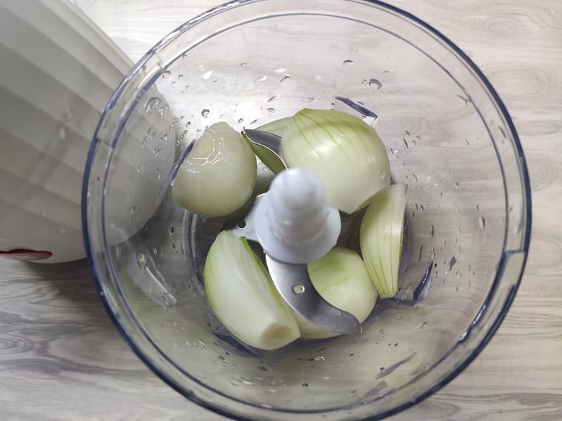 Наш второй тест — лук. Мы взяли несколько некрупных луковиц, разрезали их на 2-4 части и поместили в чашу измельчителя.