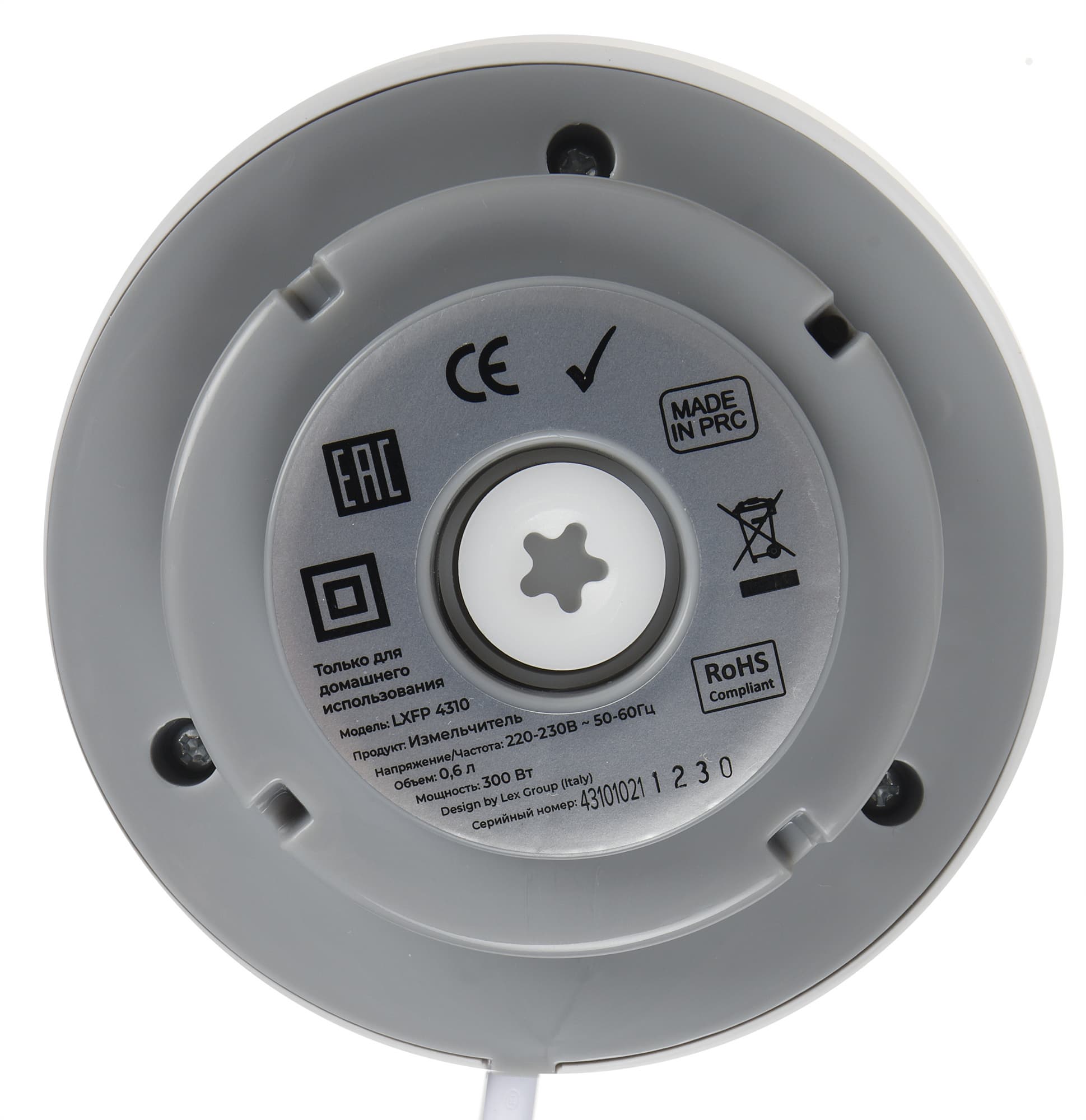 С нижней стороны блока находится пластиковое гнездо стыковки мотора с ножевыми блоком. Вокруг — надписи с технической информацией об устройстве.