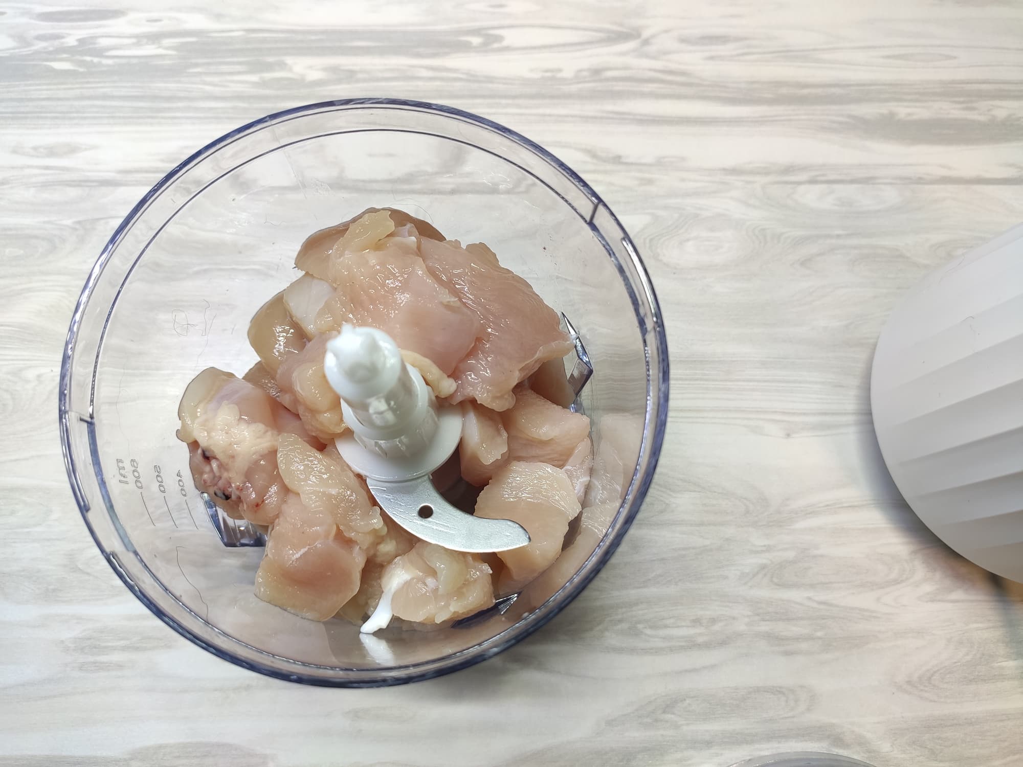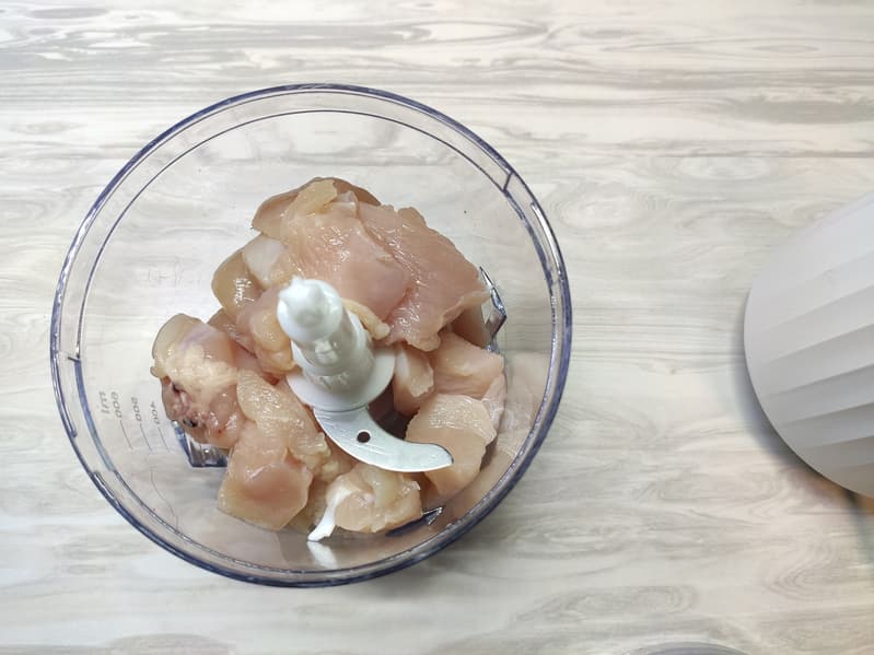 Куриное филе — один из наиболее показательных тестов, благодаря которому мы можем проверить, насколько эффективно блендер или измельчитель справляется с мясом и небольшими жилками. Мы взяли свежее куриное филе, нарезали его на кусочки подходящего (как нам показалось) размера и поместили в чашу.