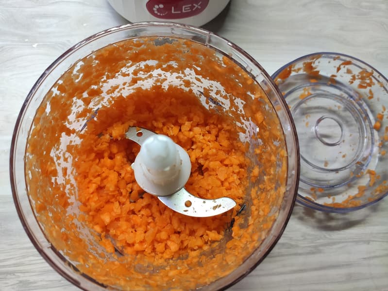 Результат — равномерная крошка из моркови без видимых вкраплений крупных частиц. Ни один кусочек не избежал попадания под нож!