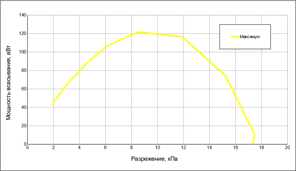 Мощность всасывания (что это такое и как мы ее измеряем, описано в отдельной статье) мы измеряли, подключив стенд к выходному отверстию гофрированного шланга. Зависимость мощности всасывания от создаваемого разрежения приведена на графике ниже: