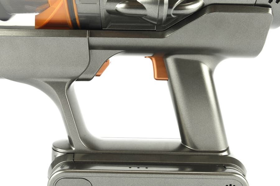 Корпус пылесоса сделан из серо-стального пластика с эффектом матового металла. С ним хорошо гармонируют оранжевые подвижные элементы и детали фильтра. Вся конструкция выглядит весьма солидно.