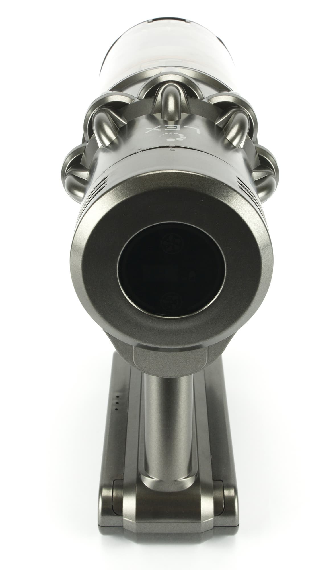 На заднем торце цилиндрического корпуса находится круглый сенсорный дисплей. Индикация на выключенном устройстве не видна — мы рассмотрим экран поближе, когда зарядим и включим пылесос.