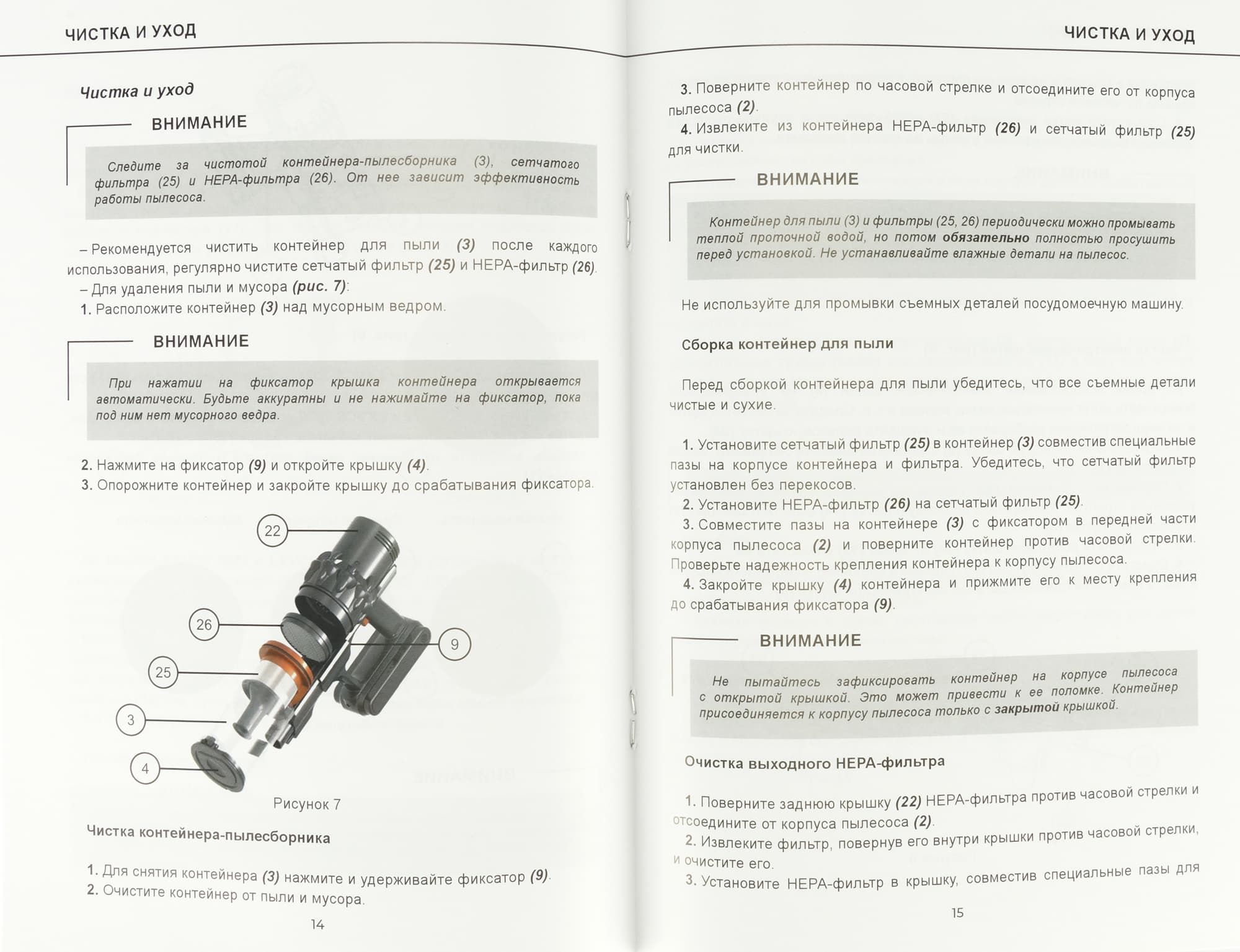 Контейнер для мусора производитель рекомендует очищать после каждой уборки. Необходимо также следить за чистотой фильтра тонкой очистки и выпускного фильтра. HEPA-элементы не рекомендуется подвергать воздействию влаги: им предписана только сухая чистка.