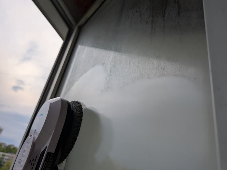 Решив отказаться от предварительного мытья, мы установили устройство на стекло и включили его в автоматическом режиме. За первый проход по внешней стороне наш робот удалил большую часть пыли и грязи, но результат был предсказуемо далек от совершенства: на стекле остались заметные разводы.