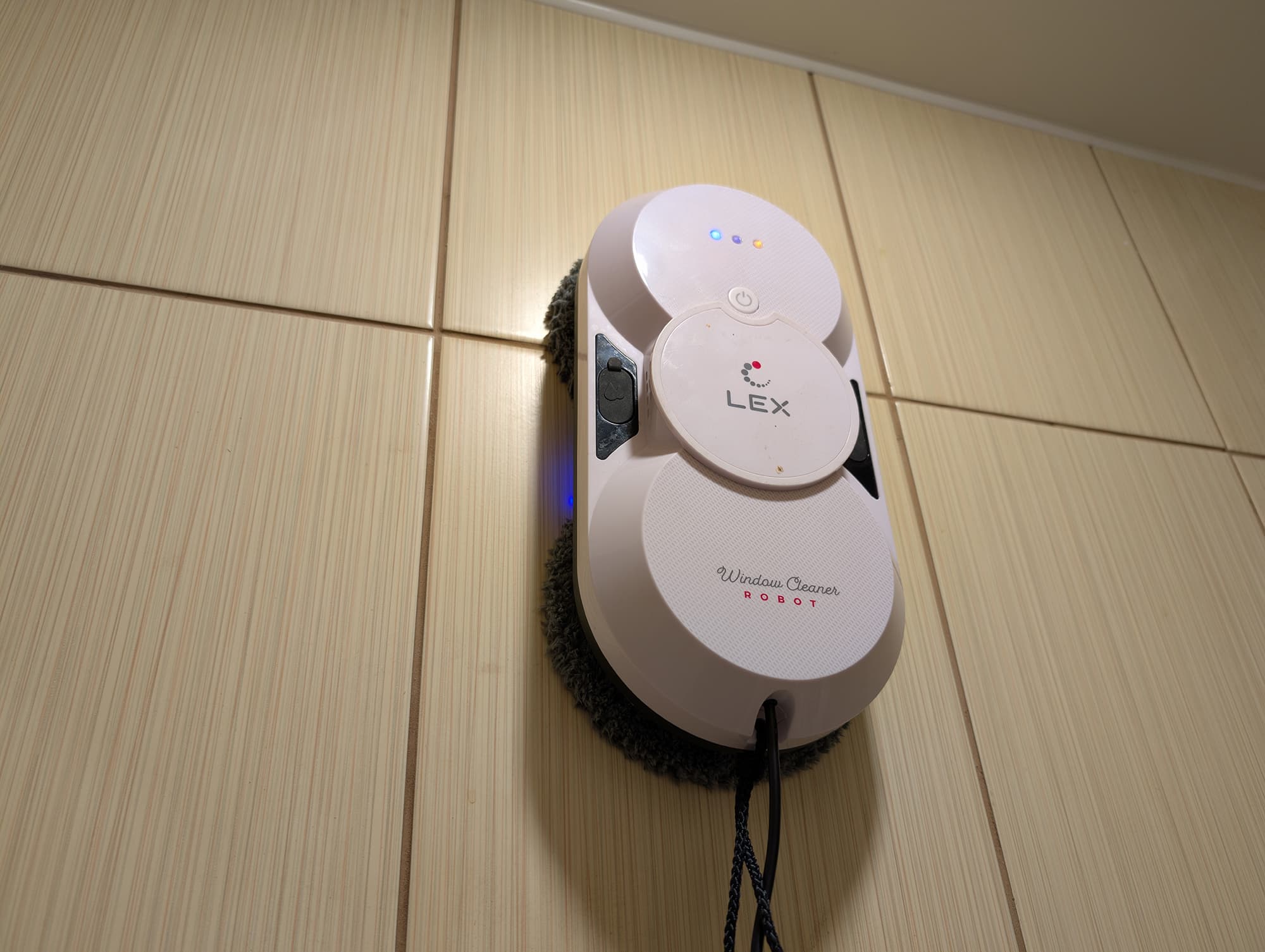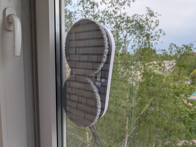 На переувлажненном стекле робот, как и написано в инструкции, может передвигаться неуверенно — в этом случае лучше удалить избыток влаги с поверхности или заменить салфетки на сухие. Но даже тогда устройство надежно держится на поверхности: в процессе использования наш прибор ни разу не сорвался с оконных стекол, зеркал или кафельной плитки. Тем не менее, пренебрегать страховочным тросиком мы категорически не рекомендуем.