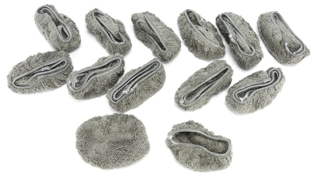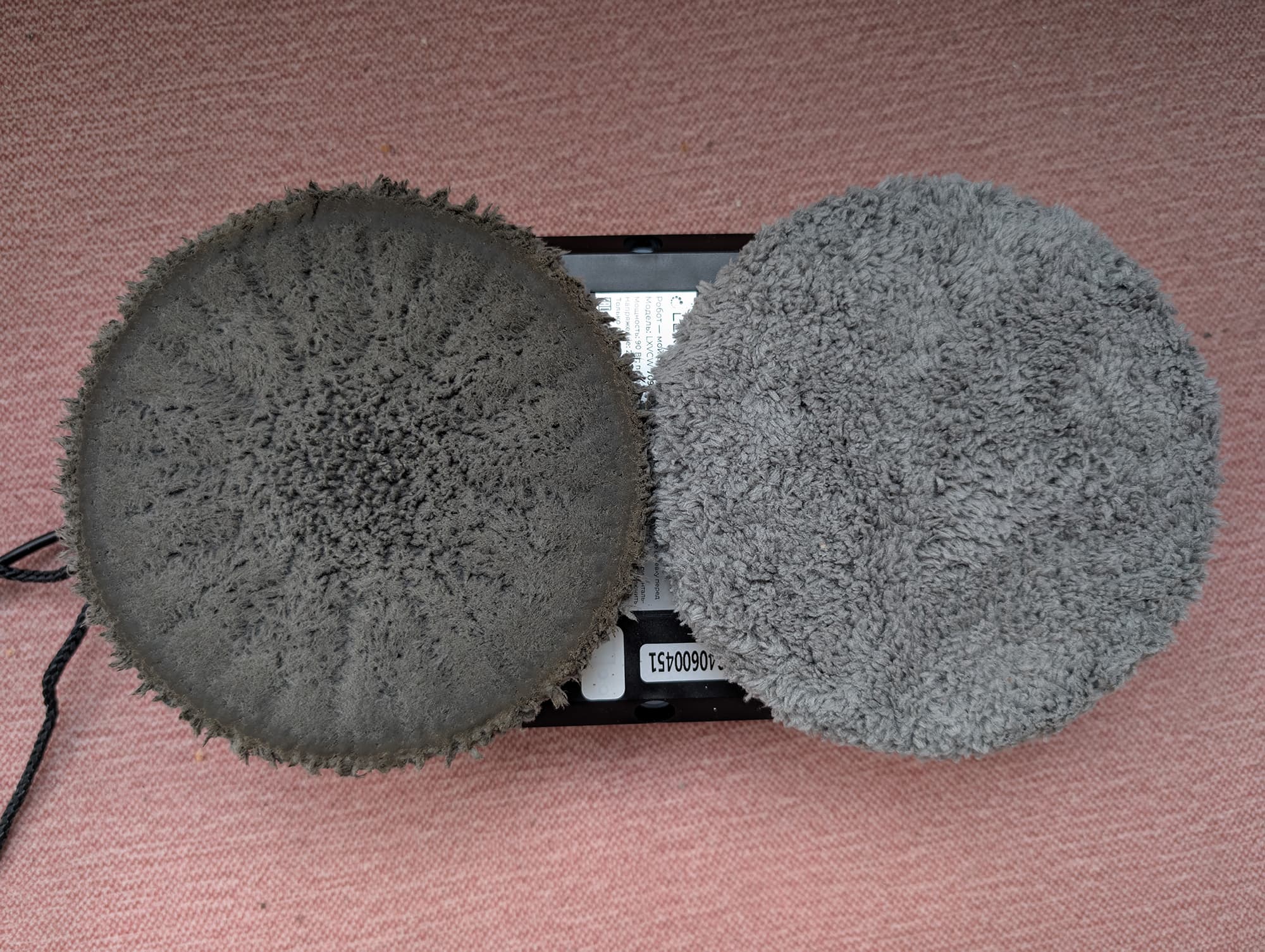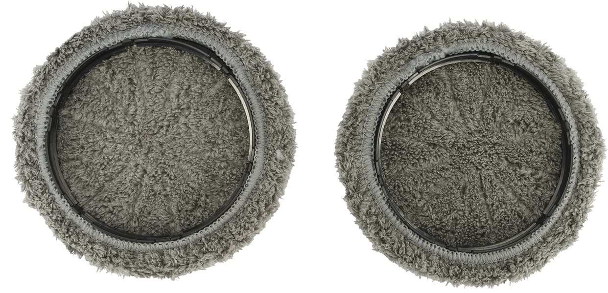 К роторам крепятся пластиковые рамки с круглыми салфетками-мопами из микрофибры практичного серого цвета. Они впитывают загрязнения и при необходимости увлажняют поверхность.