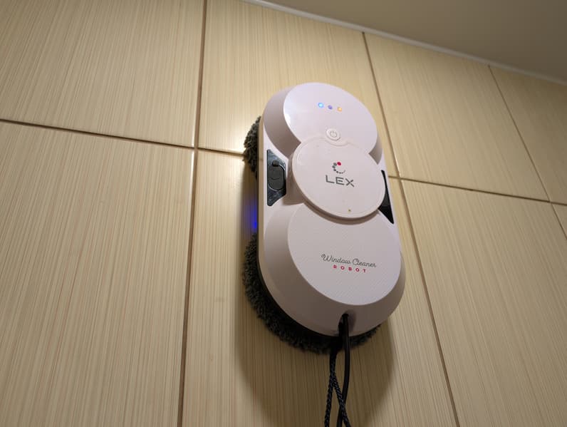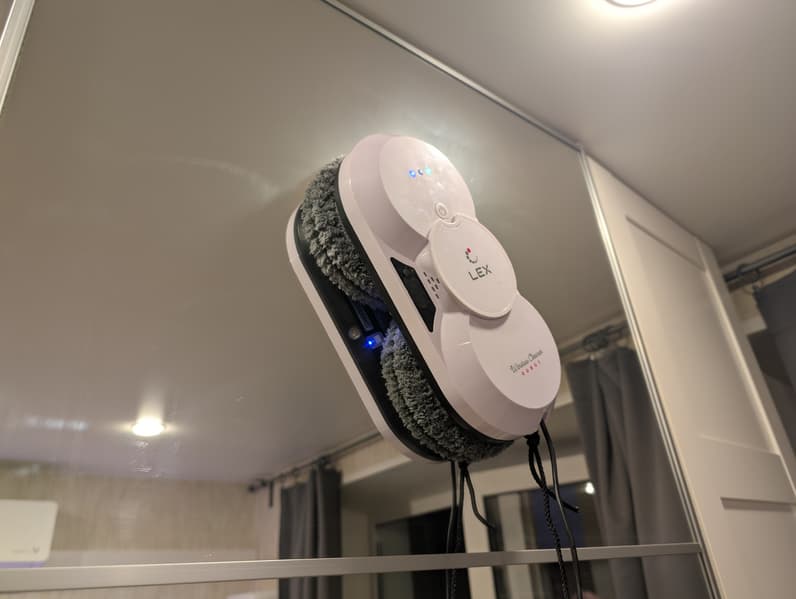 Для начала работы достаточно нажать на кнопку «Power», дождаться включения двигателя и прижать роторы устройства к стеклу. Если создаваемое разрежение воздуха обеспечивает надежное присасывание к поверхности, робот включает синий светодиод и сигнализирует о готовности к работе. Теперь можно включить автоматическую уборку коротким нажатием на «Power» или воспользоваться пультом дистанционного управления.