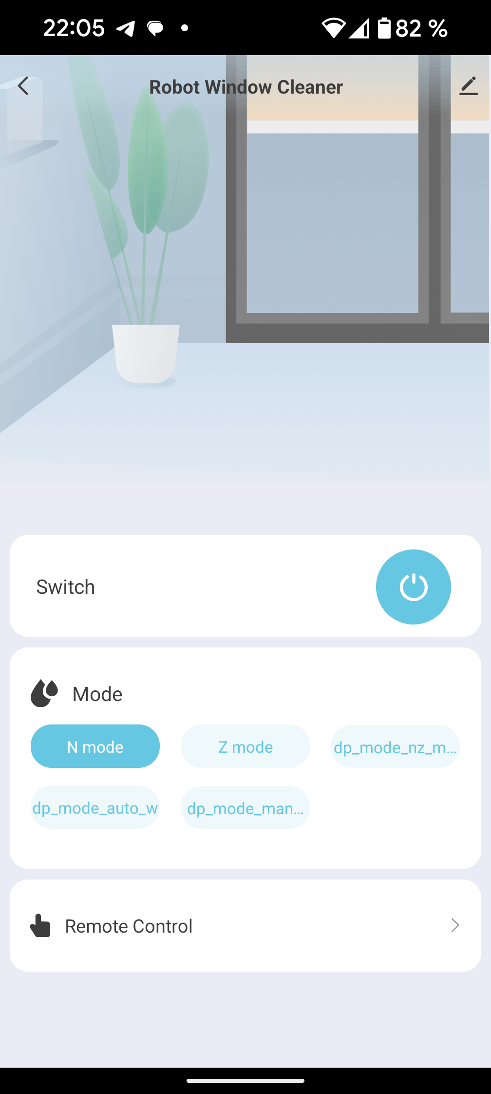 На главном экране приложения мы видим большую кнопку «Switch», переключатель режимов уборки и ссылку на экран ручного управления. Язык интерфейса — английский, налицо некоторые проблемы с версткой (надписи на кнопках показываются не полностью).