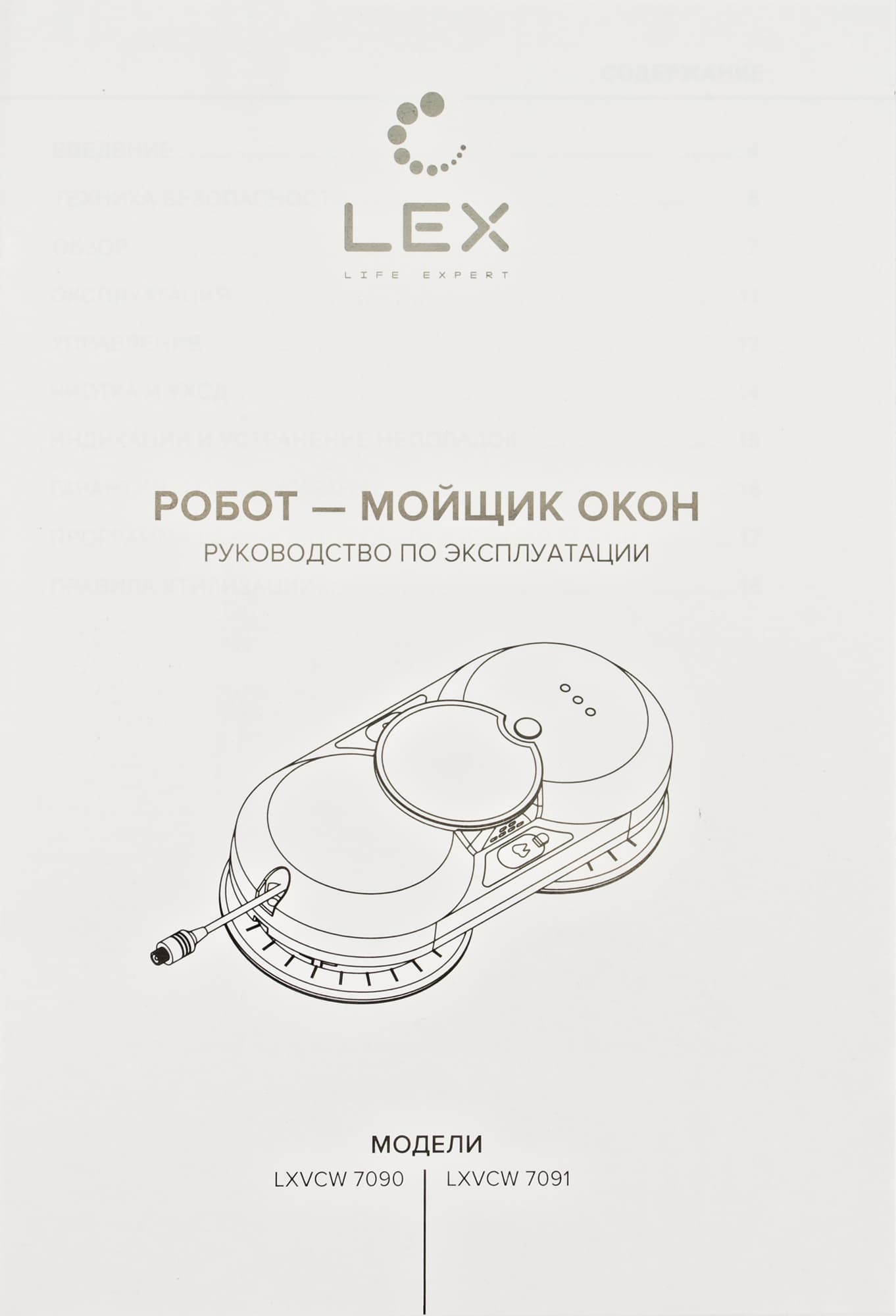 Документ описывает сразу две сходных модели мойщиков стекол от Lex. В нем коротко рассказывается о назначении и применении устройства, приведены технические характеристики, описывается управление роботом и возможные неполадки с методами их самостоятельного устранения.