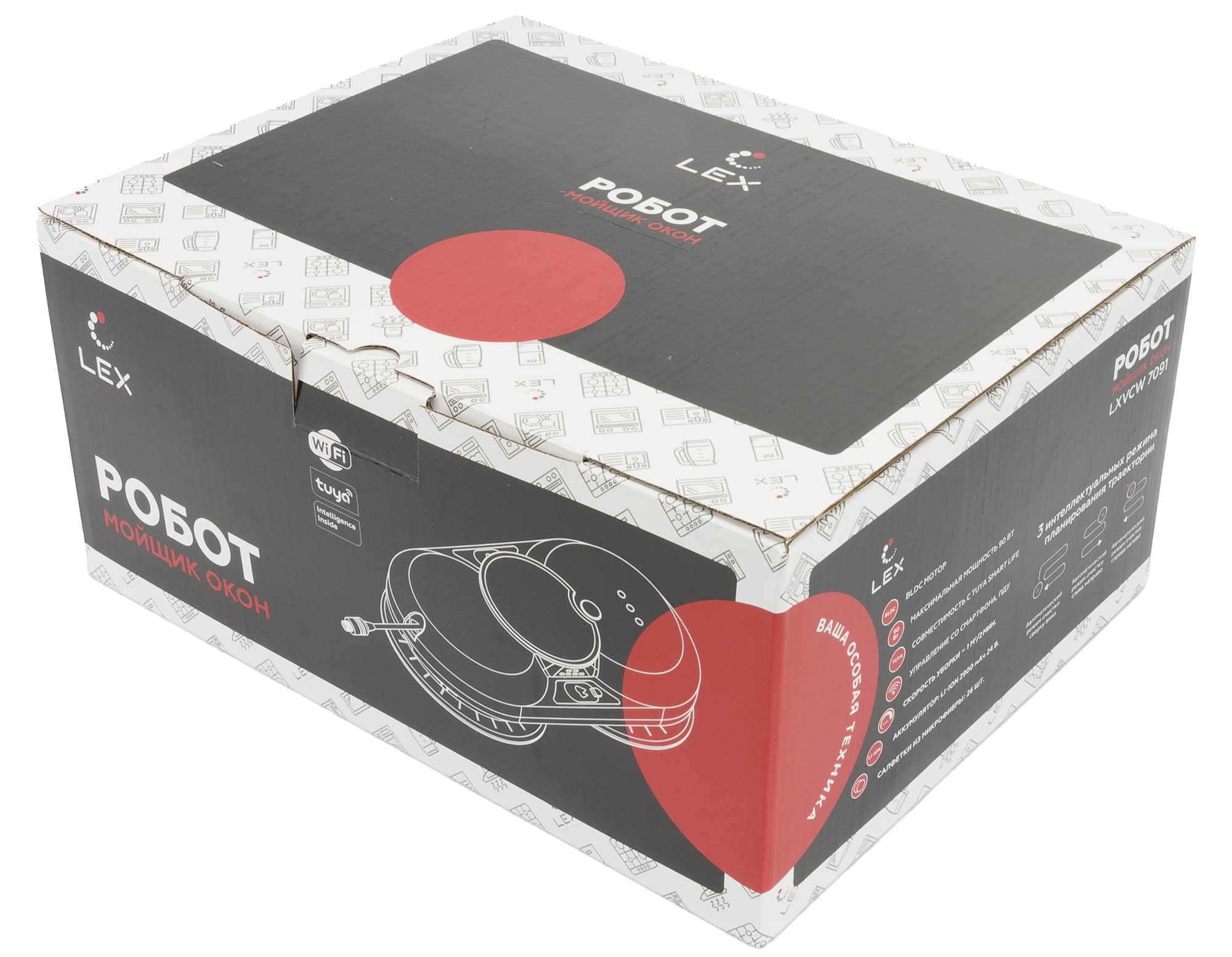 Робот для мытья окон Lex LXVCW 7091 поставляется в картонной коробке с фирменным дизайном. От возможных повреждений при доставке и транспортировке она защищена дополнительной упаковкой из коричневого картона.