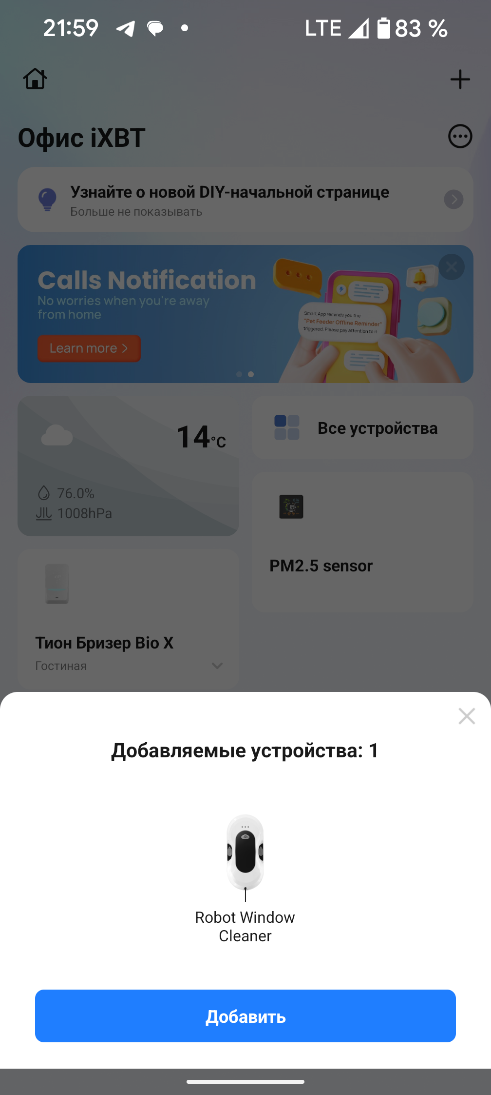 Включенный робот автоматически появляется в приложении: пользователю остается только нажать на кнопку «Добавить» и подождать с полминуты. Процесс сопряжения проходит быстро и завершается без затруднений.
