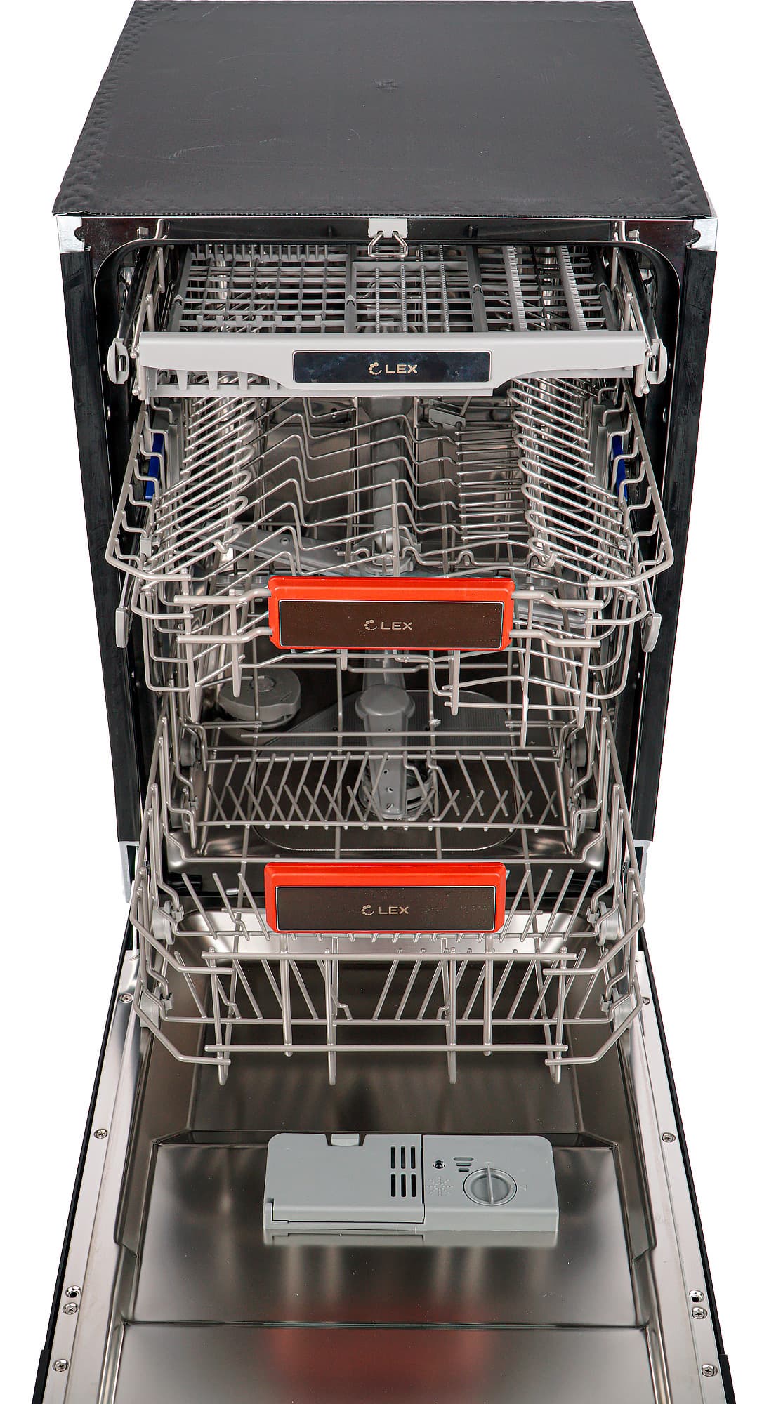 Lex PM 4573 оборудована тремя корзинами. Нижняя предназначена для крупной посуды — кастрюль, сковород и больших тарелок, в среднюю традиционно загружаются небольшие тарелки, блюдца и чашки.