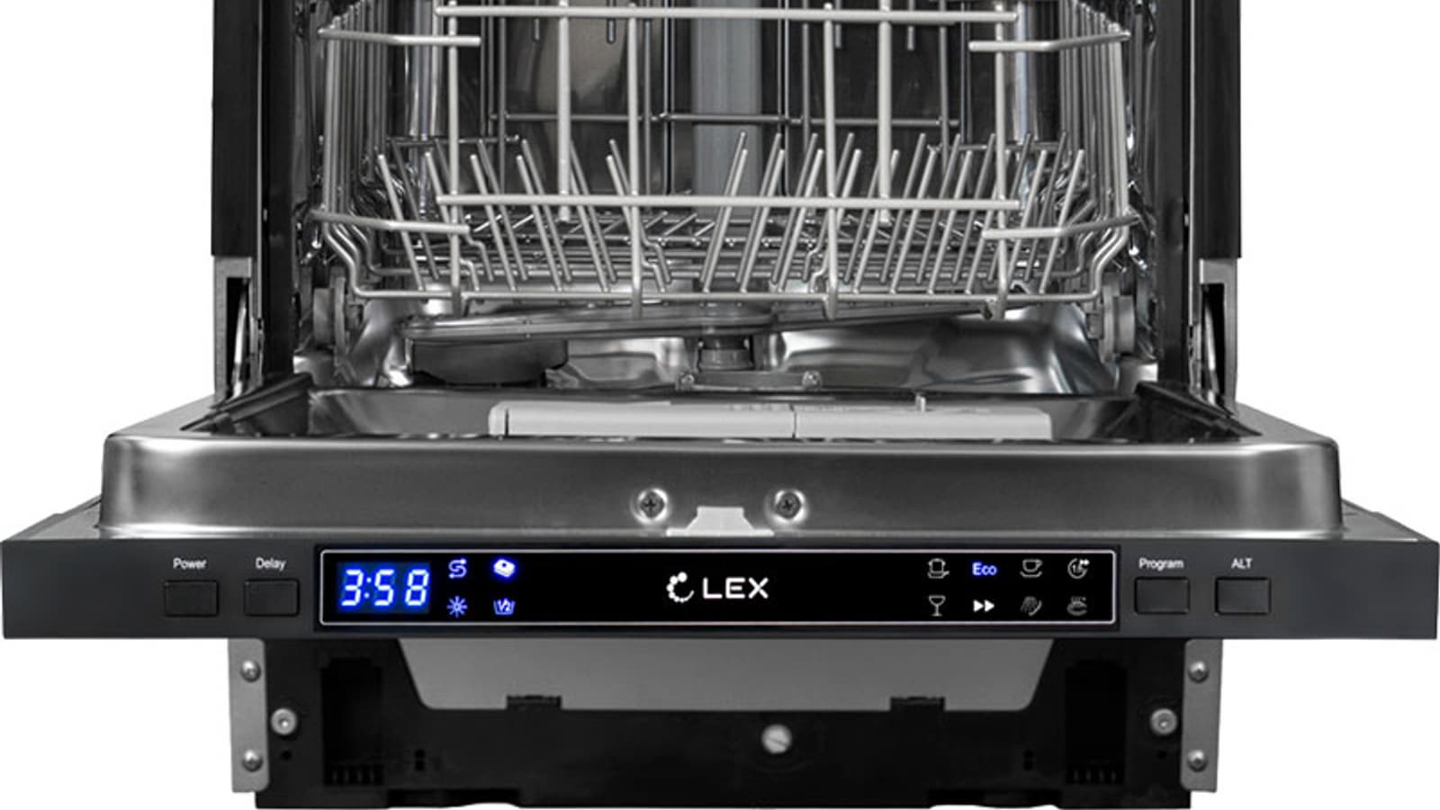 Как у всех полновстраиваемых посудомоек, органы управления у Lex PM 4573 сосредоточены на верхней кромке дверцы и после установки под столешницу доступны только на приоткрытой дверце.