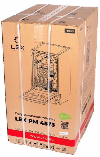 Посудомоечная машина Lex PM 4573 прибыла к нам на тестирование в картонной коробке с трехцветной печатью.