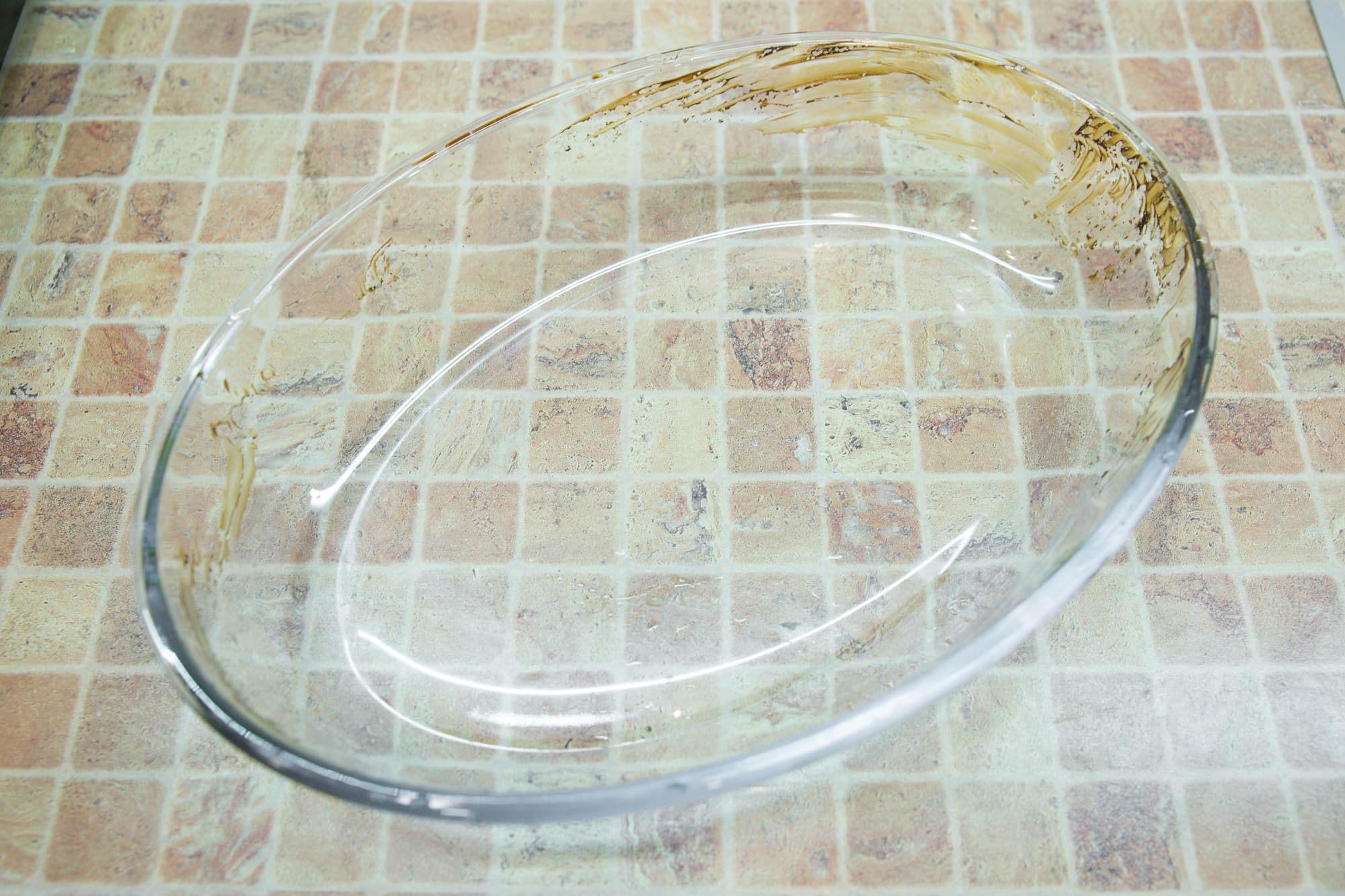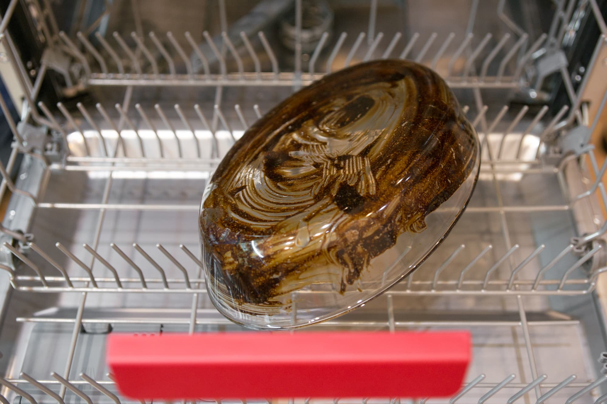 Для тестирования программы, предназначенной для отмывания интенсивных загрязнений, мы использовали стеклянную форму, в которой запекалось мясо в сметанном соусе. После опустошения формы дополнительно размазали по дну и стенкам майонез и поставили в духовку в режиме Гриль на 10 минут, чтобы загрязнения пригорели посильнее.