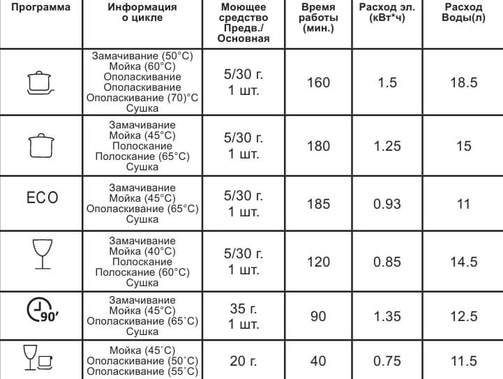 | Программа | Расход энергии, кВт·ч | Расход воды, л | ||