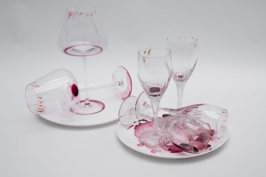 У нас в наличии было четыре бокала высотой 20 см и пара бокалов около 25 см из ультратонкого хрупкого стекла. Каждый мы изрядно напачкали жирной губной помадой и красным вином и оставили подсыхать, как и в предыдущих тестах, на сутки.
