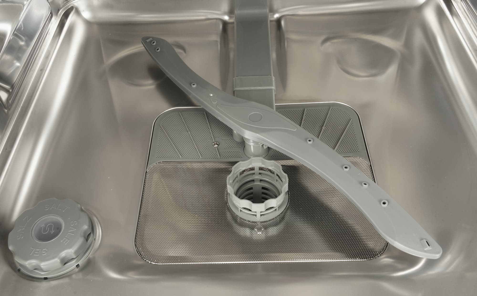 Устройство имеет две вместительные корзины с дополнительной подставкой под мелкие столовые приборы, что позволяет размещать внутри до 14 комплектов посуды. Посуда в этой модели омывается тремя разбрызгивателями на разных уровнях, что обещает особенно тщательное мытье. Нам остается проверить. Приступим.