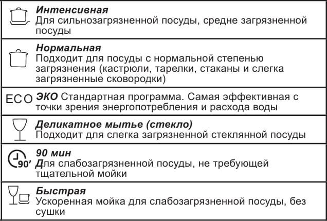 | Количество программ | 6 (нормальный, интенсивный, экономный, стекло, 90 минут, быстрый) |