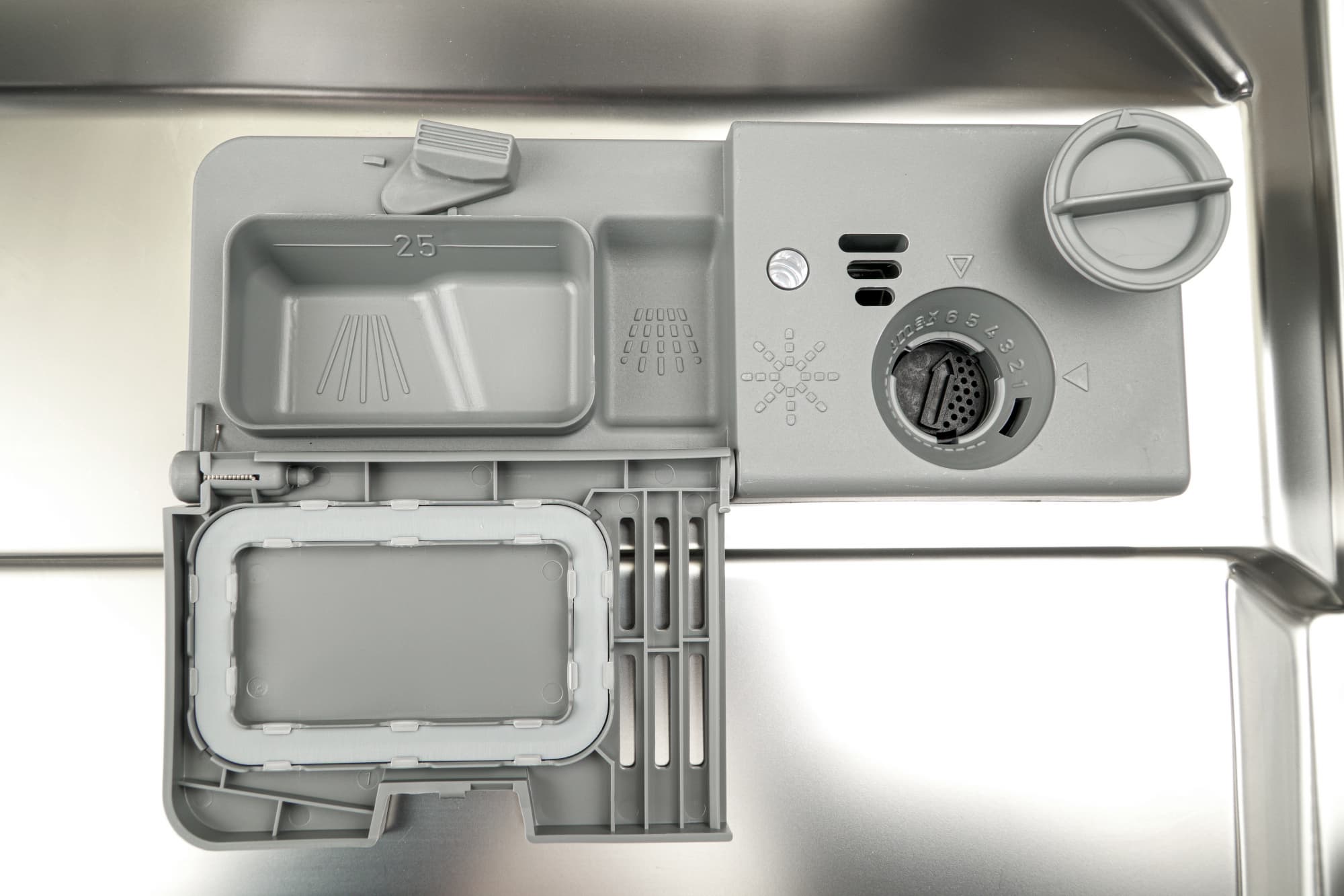 Контейнер для моющих средств и ополаскивателя имеет весьма классический формат: в два отсека в левой части кладут средства для основной и дополнительной мойки. Для основной можно использовать и порошковые средства, и таблетки «3 в 1». Емкость для предварительной рассчитана только на порошок. В правой части — отсек для ополаскивателя: его, как обычно, закрывает пробка. Есть в нем и традиционный регулятор расхода.