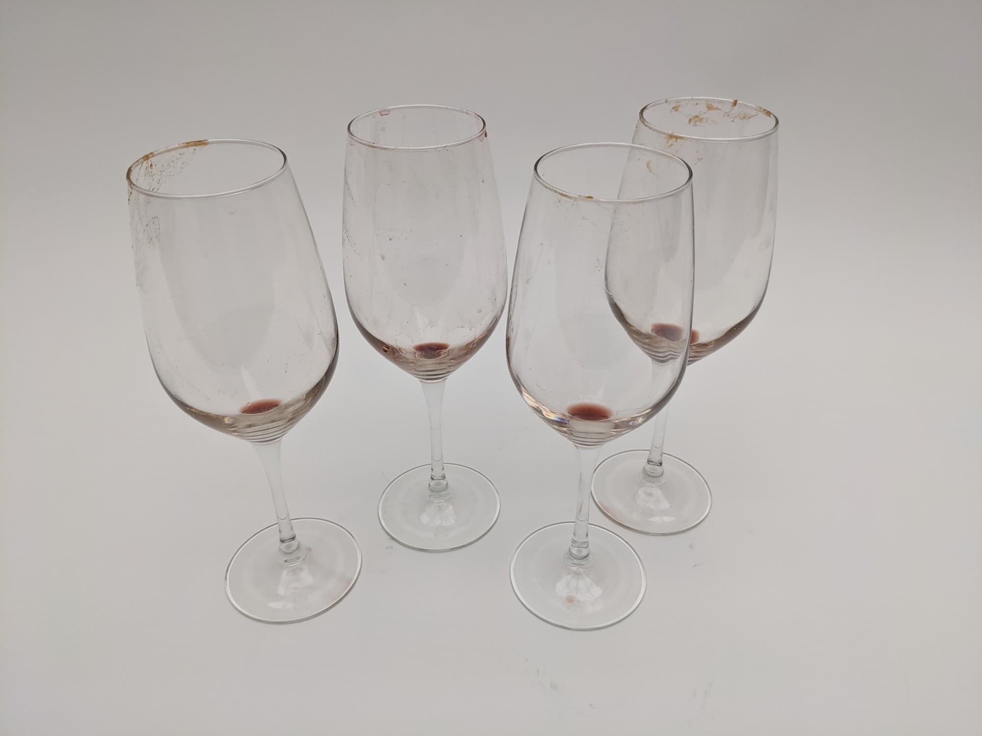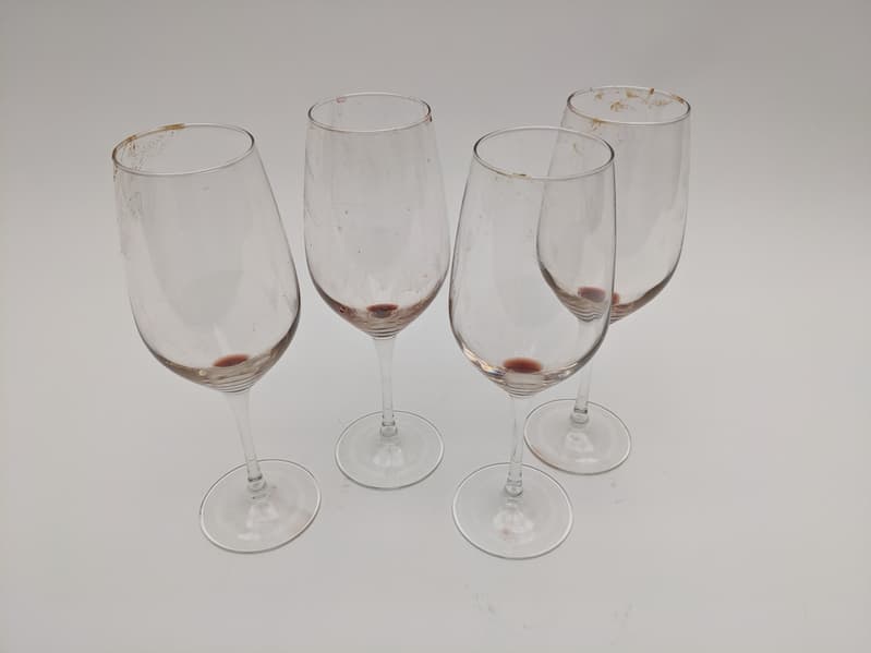 Несколько тонких стеклянных бокалов испачкали губной помадой и красным вином, имитируя бурную вечеринку. Как и в предыдущих тестах, посуду оставили высыхать в течение суток.