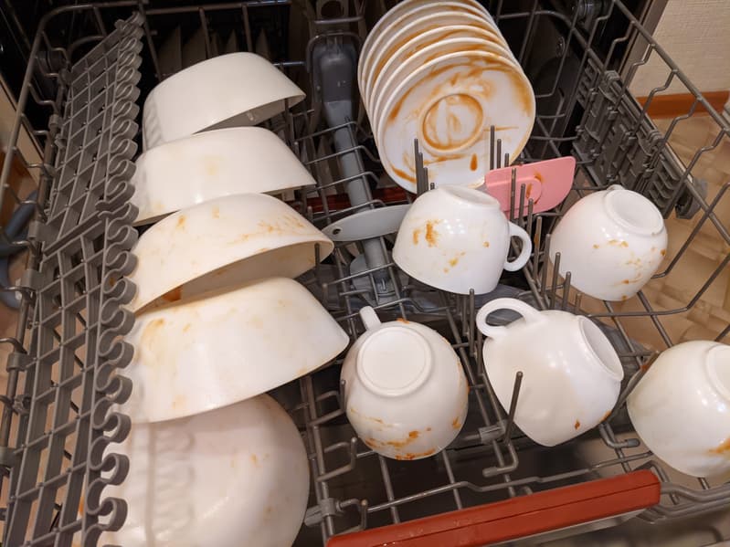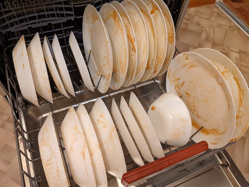 Причем сделали это, как видно на фотографии, равномерно, но умышленно неаккуратно. Для большего эффекта загруженная и открытая посудомойка постояла с посудой в течение суток.
