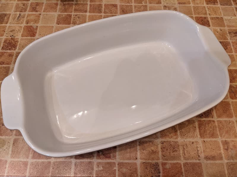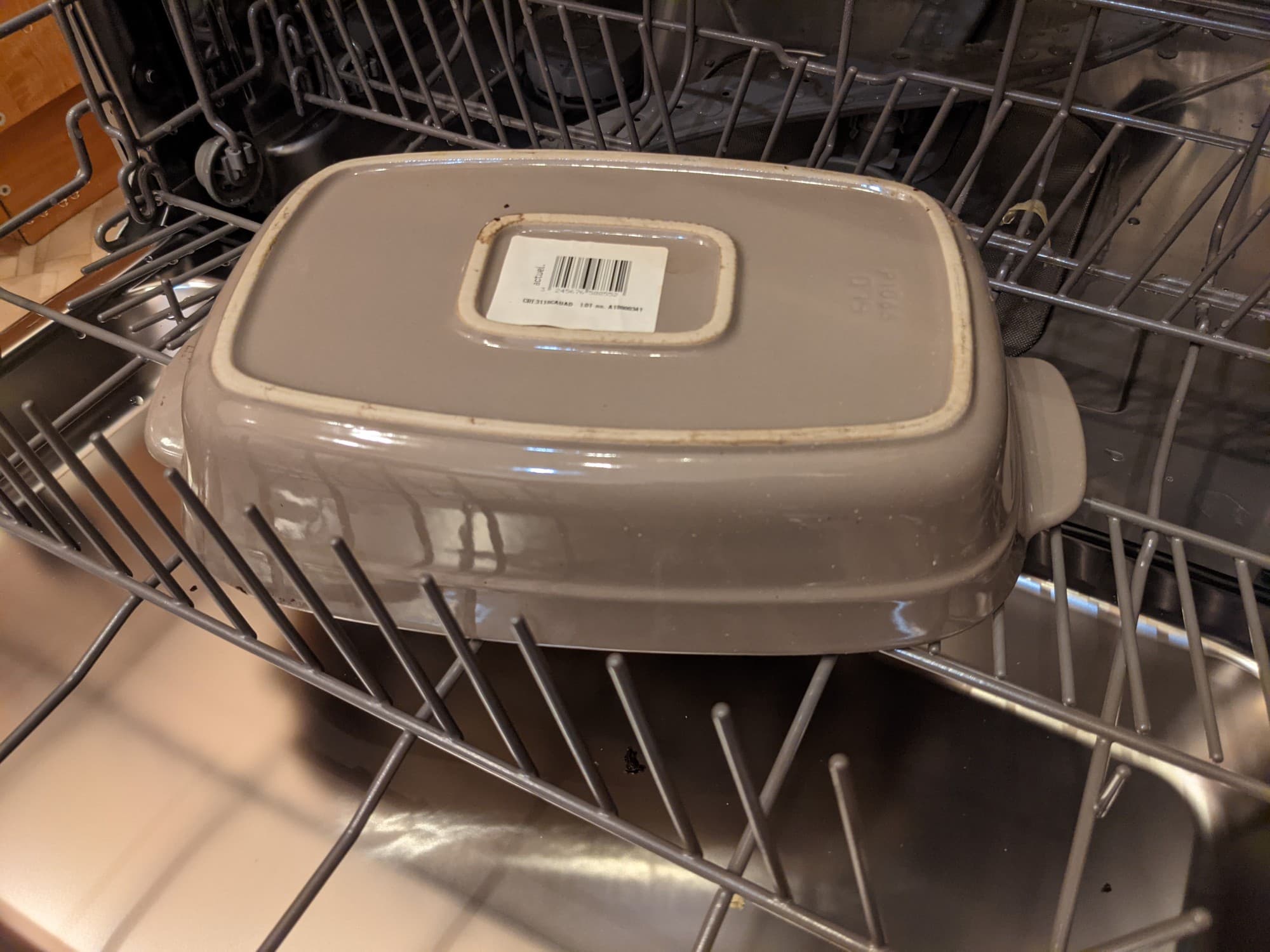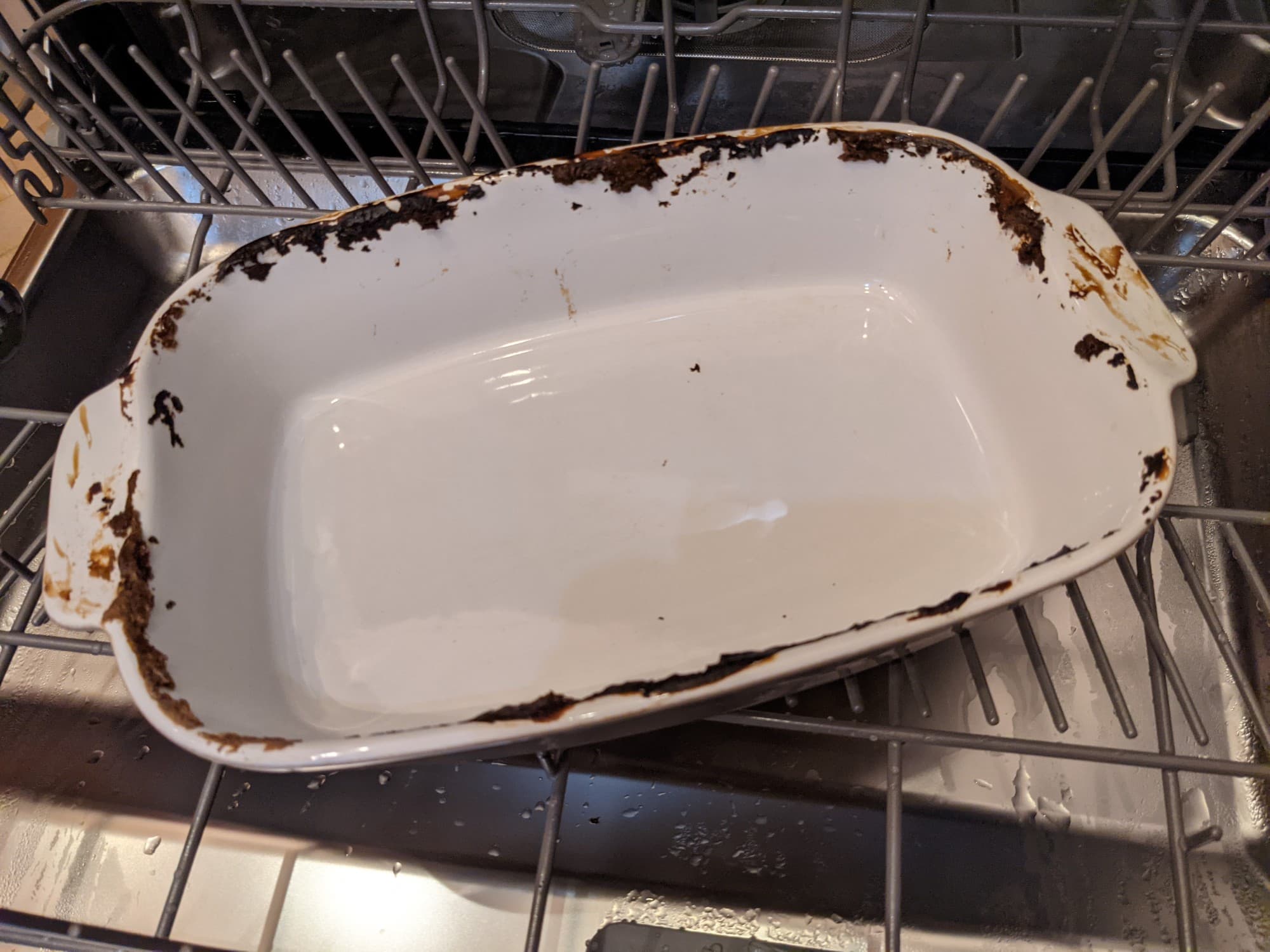 Для тестирования программы, предназначенной для отмывания интенсивных загрязнений, мы использовали керамическую форму, в которой запекалось мясо в сметане. Для усиления стойкости грязи опустошили форму и вернули ее в горячую духовку примерно на 15 минут, чтобы остатки жира и сметаны посильнее пригорели.