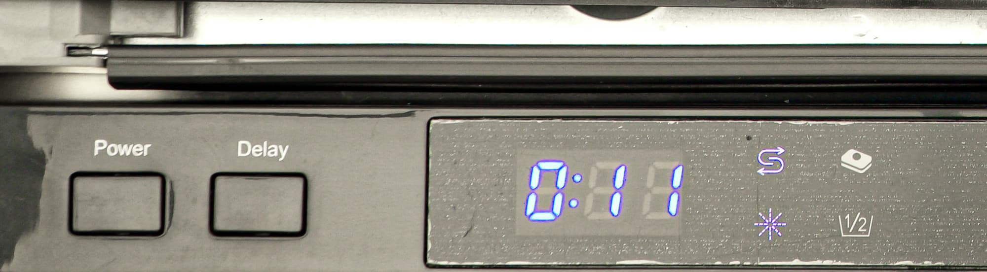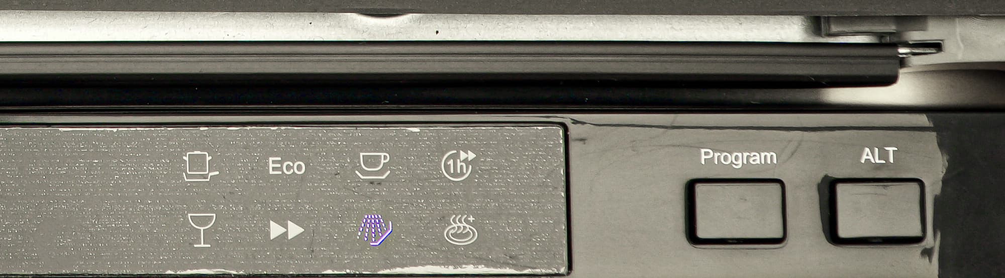 Как у всех полновстраиваемых посудомоек, органы управления располагаются на верхней кромке дверцы. Как только машина уйдет под столешницу, манипулировать кнопками можно будет только на приоткрытой дверце.