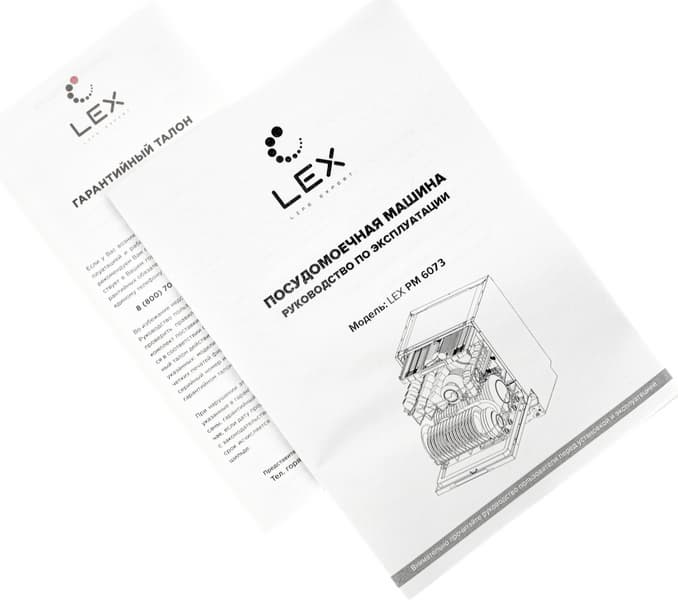 Руководство по эксплуатации Lex PM 6073 довольно толстое, напечатано на плотной бумаге. На белой матовой обложке схематично нарисована посудомоечная машина. Шрифт приятен для чтения, но кое-где на полях не пропечатался.