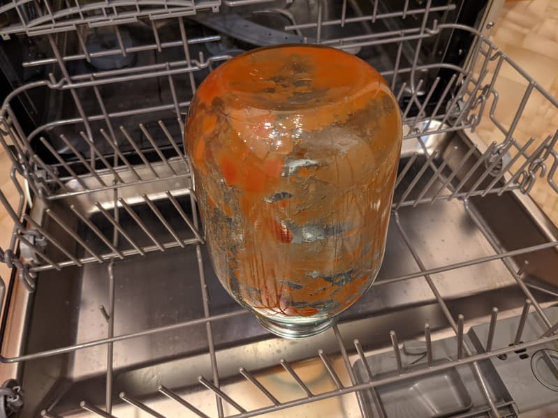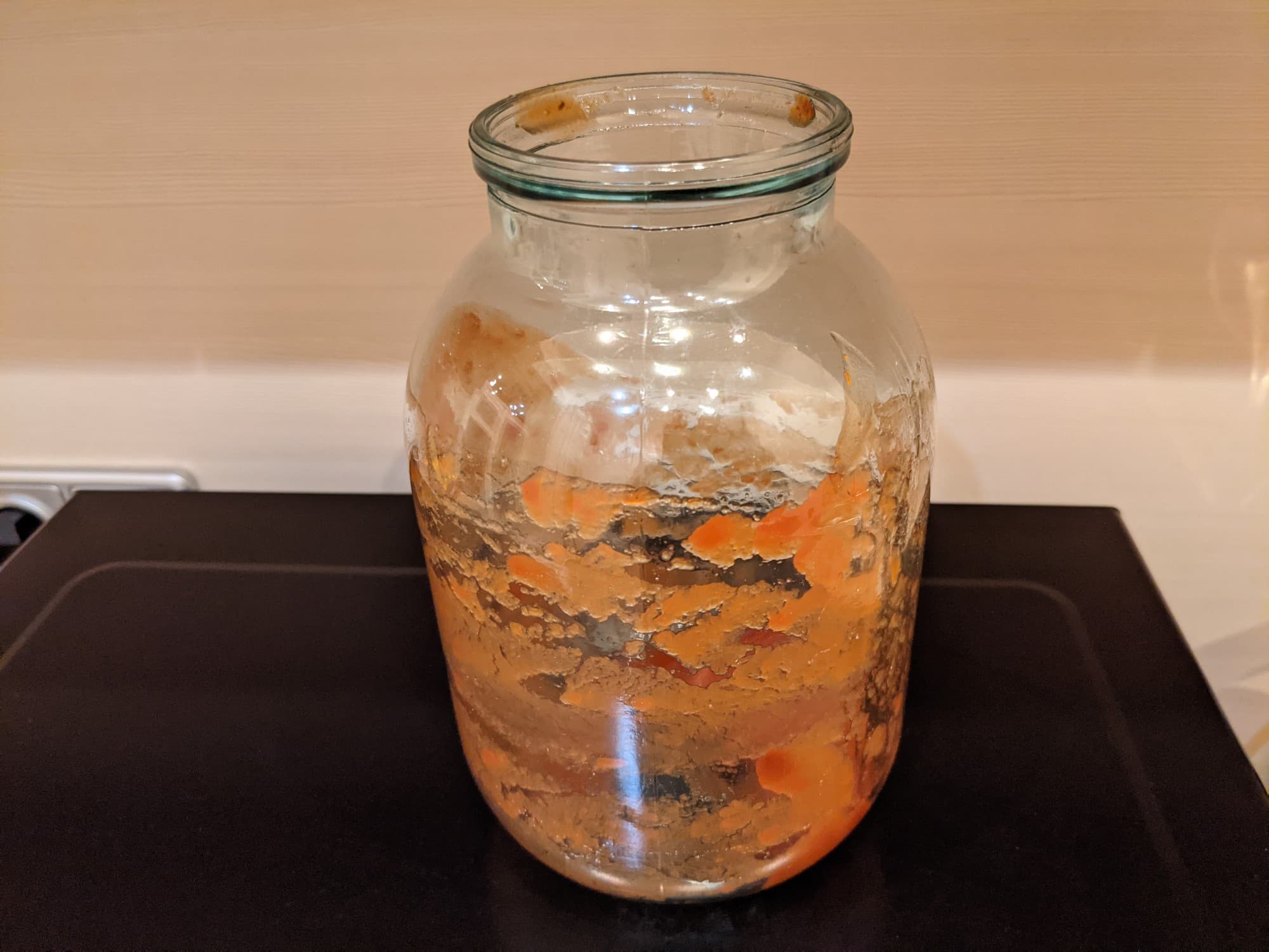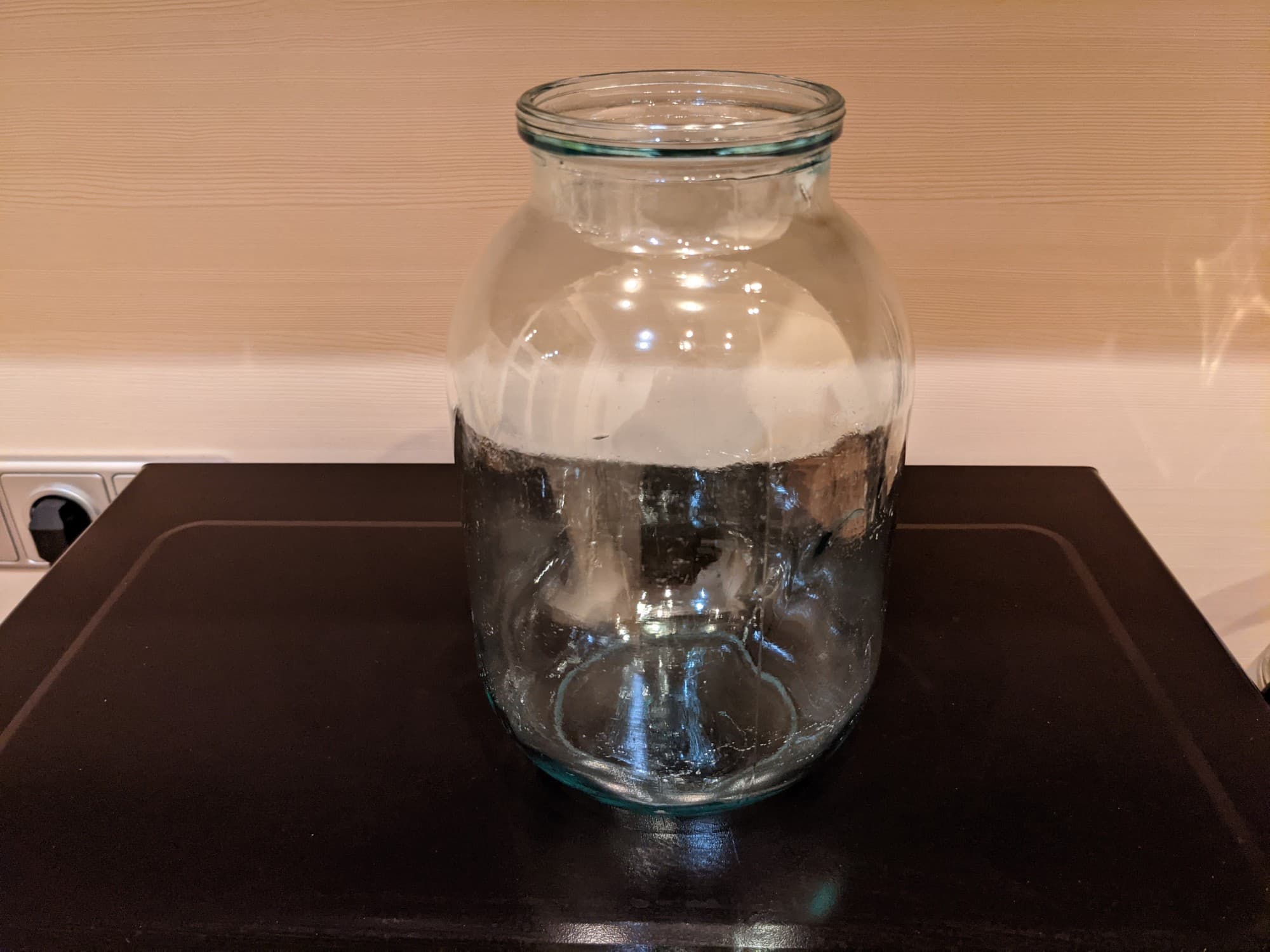 Стеклянную трехлитровую банку мы испачкали изнутри кетчупом и оставили на сутки для высыхания загрязнений.