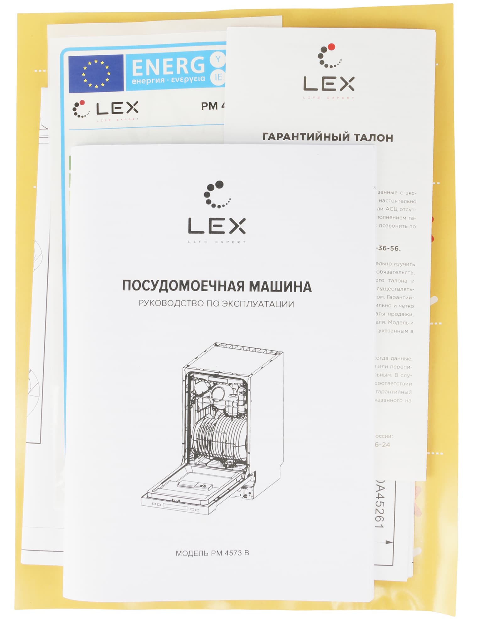 Посудомоечная машина Lex PM 4573 B поставляется в картонной коробке с двухцветной печатью. На гранях упаковки размещены: логотип бренда, полное наименование модели, ее схематические изображения, приведен ряд технических характеристик и транспортировочных значков.