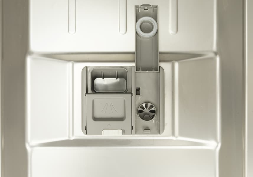Контейнер состоит из двух частей: большая, со сдвижной заслонкой, предназначена для порошка или таблеток, а в меньшей за откидывающейся крышкой скрывается резервуар для ополаскивателя со встроенным регулятором расхода средства.