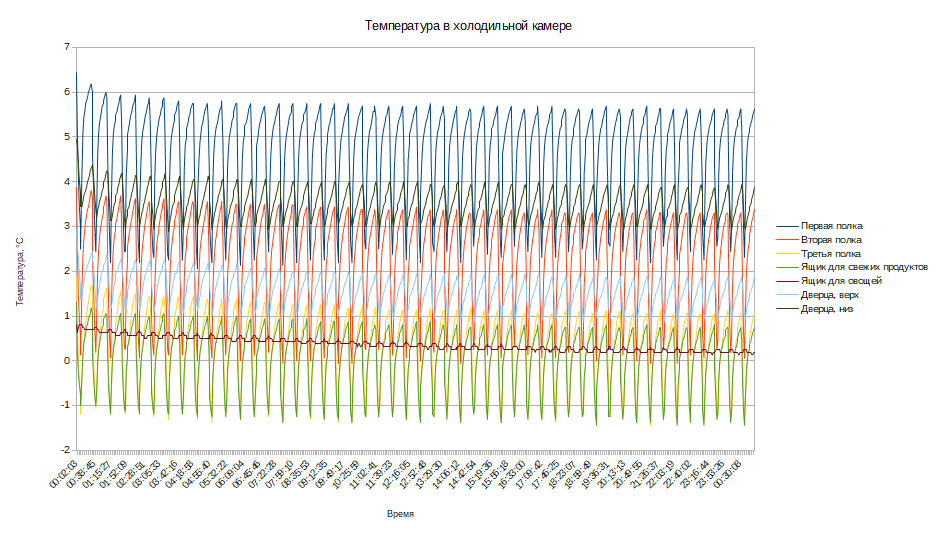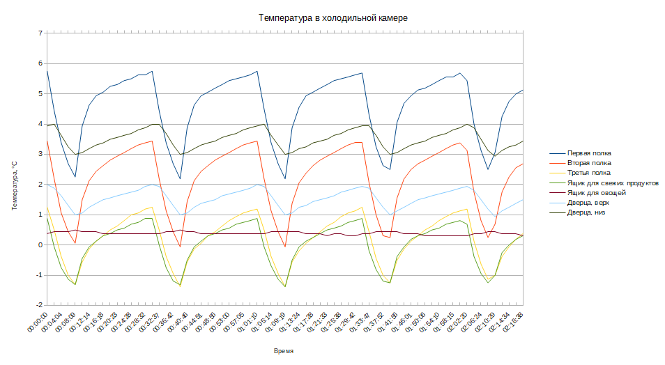 Заметим, что эти графики иллюстрируют не потребительские качества холодильника, а особенности логики работы холодильного агрегата и циркуляции холодного воздуха между зонами камеры. Не следует удивляться таким, на первый взгляд, существенным колебаниям: охлажденные продукты обладают значительно большей тепловой инерцией, нежели воздух в камере, и переносят циклические изменения температуры нормально.