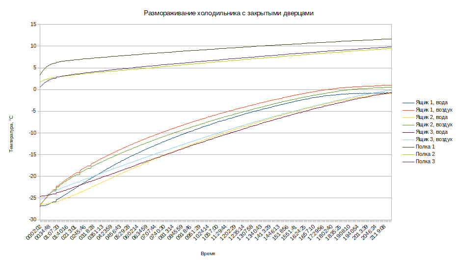 Чтобы оценить теплоизоляцию корпуса и понять, как долго удерживает температуру отключенное от сети устройство, мы выключили предварительно охлажденный прибор с балластом и понаблюдали за изменением температуры.
