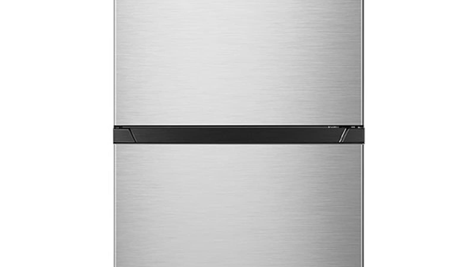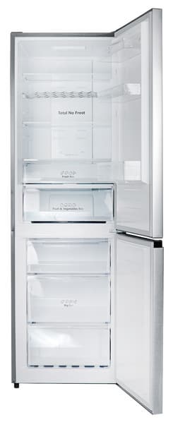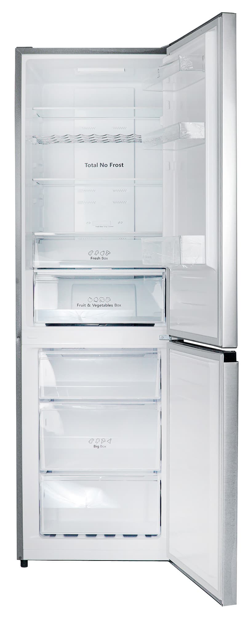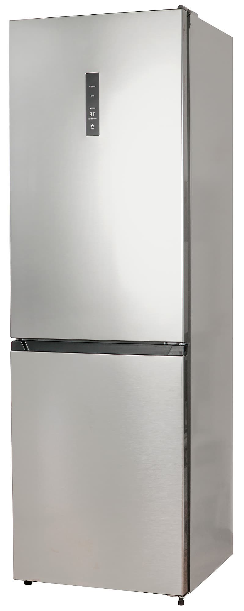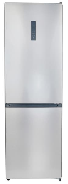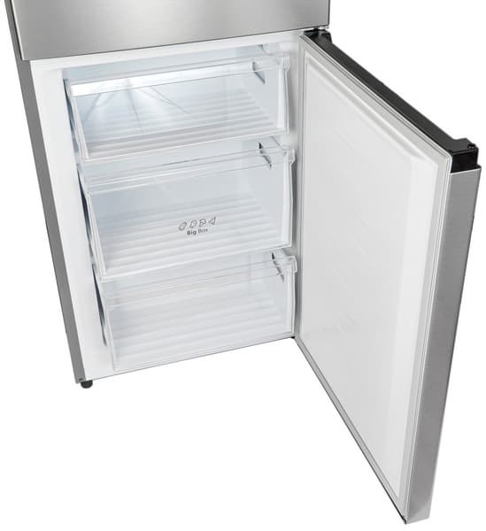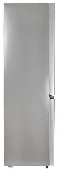 Передняя сторона холодильника оформлена строго и изящно. Дверцы холодильного и морозильного отделения выполнены из серебристого металла с легким матированием горизонтальными линиями. В верхней части дверцы холодильного отделения — панель управления из черного пластика.