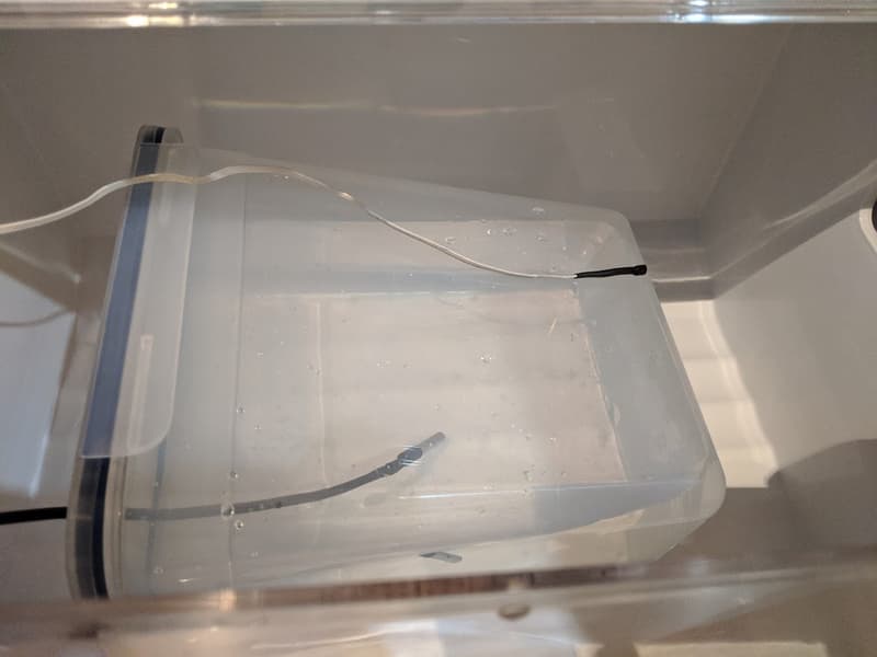 Помимо датчиков температуры воды использовались такие же, но для воздуха. Их мы поместили рядом с контейнерами в те же ящики — так, чтобы поверхность сенсоров не контактировала напрямую с элементами корпуса морозильной камеры.