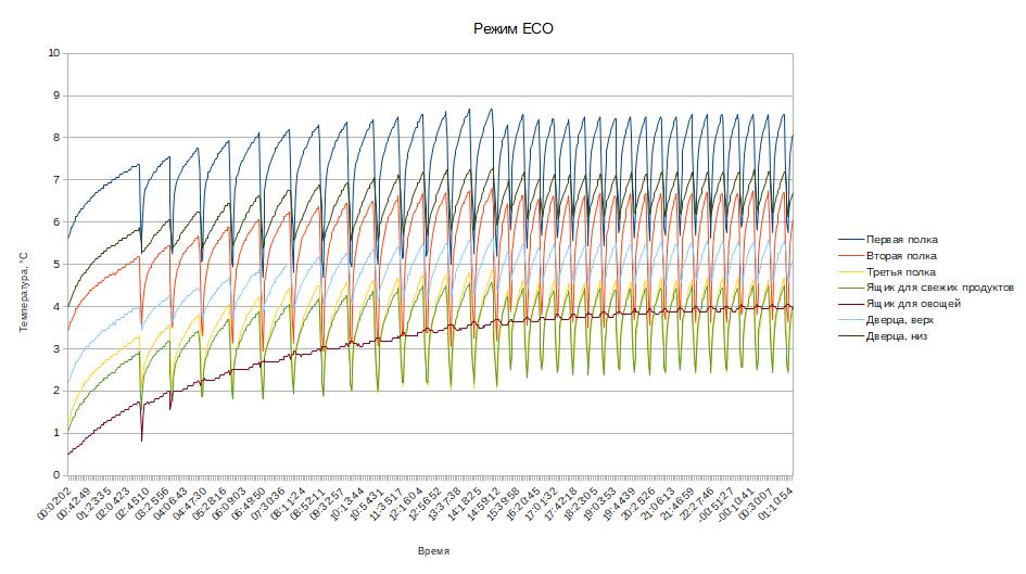Перед началом теста температура в холодильной камере была установлена на значение «+2 °C». После активации режима «Eco» компрессор «отдыхал» в течение почти трех часов, а затем продолжил работу в импульсном режиме. Через 15 часов после нажатия на кнопку ритм компрессора изменился: паузы между включениями уменьшились, периоды работы стали короче. Температура в холодильной повысилась и на протяжении последующих суток сохранялась в диапазоне от +3,5 до +7 °C.