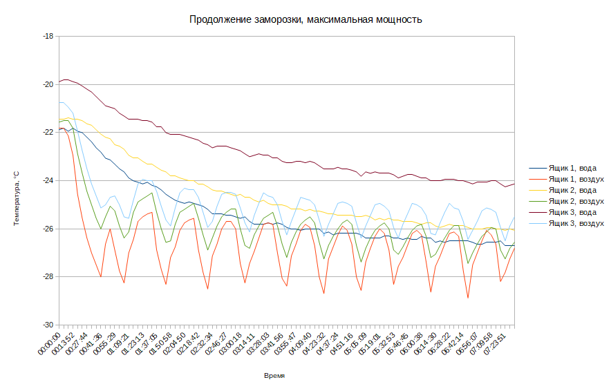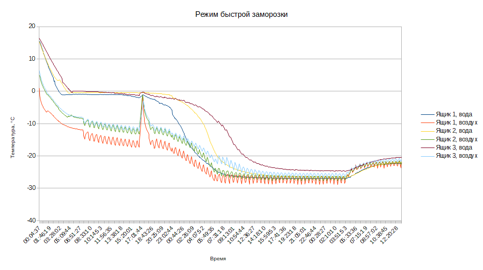 На температурном графике можно видеть, что вода в контейнерах охладилась до 0 °C приблизительно за пять часов. Переход в стадию льда был зафиксирован через семнадцать часов с момента начала теста. Стабильной температуры балласт достиг через 39 часов, а общая продолжительность работы в режиме быстрой заморозки составила 52 часа — в точности, как обещано в руководстве. По истечении этого времени температура начала плавно подниматься до установленных вручную 19 °C.