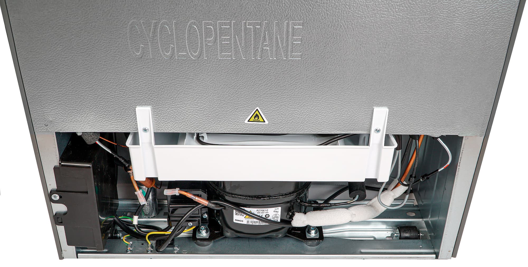 Ниша компрессора расположена в нижней части задней стенки. Сверху в ней находится пластиковое корытце для сбора конденсата.