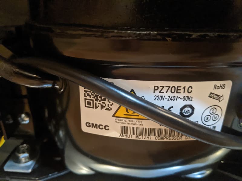 Компрессор PZ70E1C установлен на четырех болтах, прикрученных к дну, и снабжен амортизирующей опорой. Согласно информации на агрегате, он изготовлен компанией GMCC (Guangdong Midea-Toshiba Compressor Company) — одним из ведущих производителей компрессоров для холодильного оборудования.