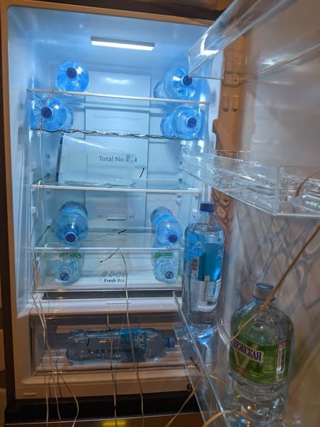Чтобы имитировать работу загруженного холодильника, в процессе тестирования холодильной камеры мы также использовали водяной балласт в таких же четырехлитровых контейнерах, как и при испытании морозилки. Кроме того, на полках и дверце холодильника положили несколько пластиковых бутылок с водой.