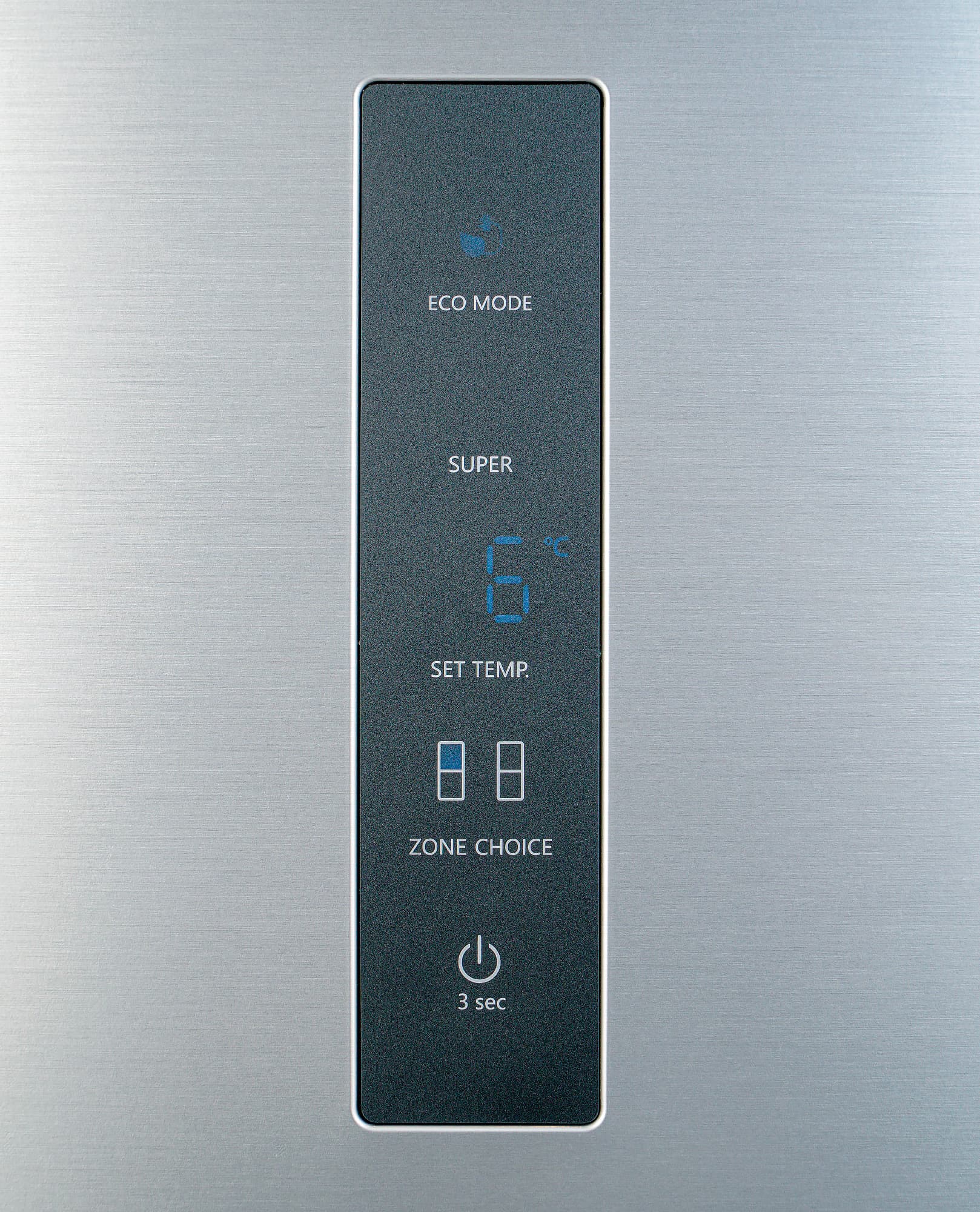 Температура внутри холодильной и морозильной камер устанавливается одной и той же кнопкой «Set temp» с цифровым индикатором. Нажатием на «Zone choice» пользователь выбирает камеру (индикатор над ней подсвечивает холодильник или морозилку на схематическом изображении), а кнопкой выбора температуры последовательно выставляет нужный режим охлаждения. Для холодильной камеры доступны установки от +2 до +8 °C с шагом в один градус, а температуру морозильной камеры можно изменить в диапазоне от −14 до −24 °C.