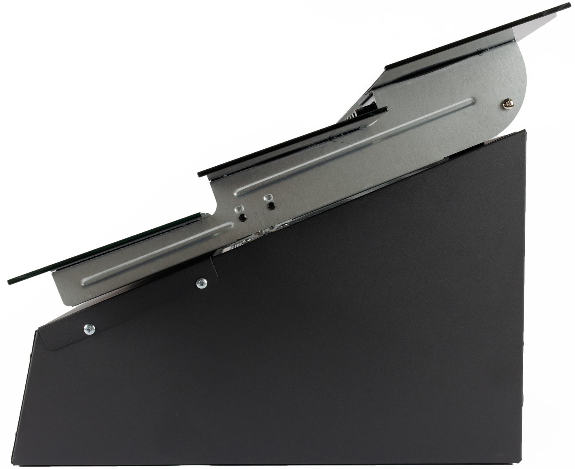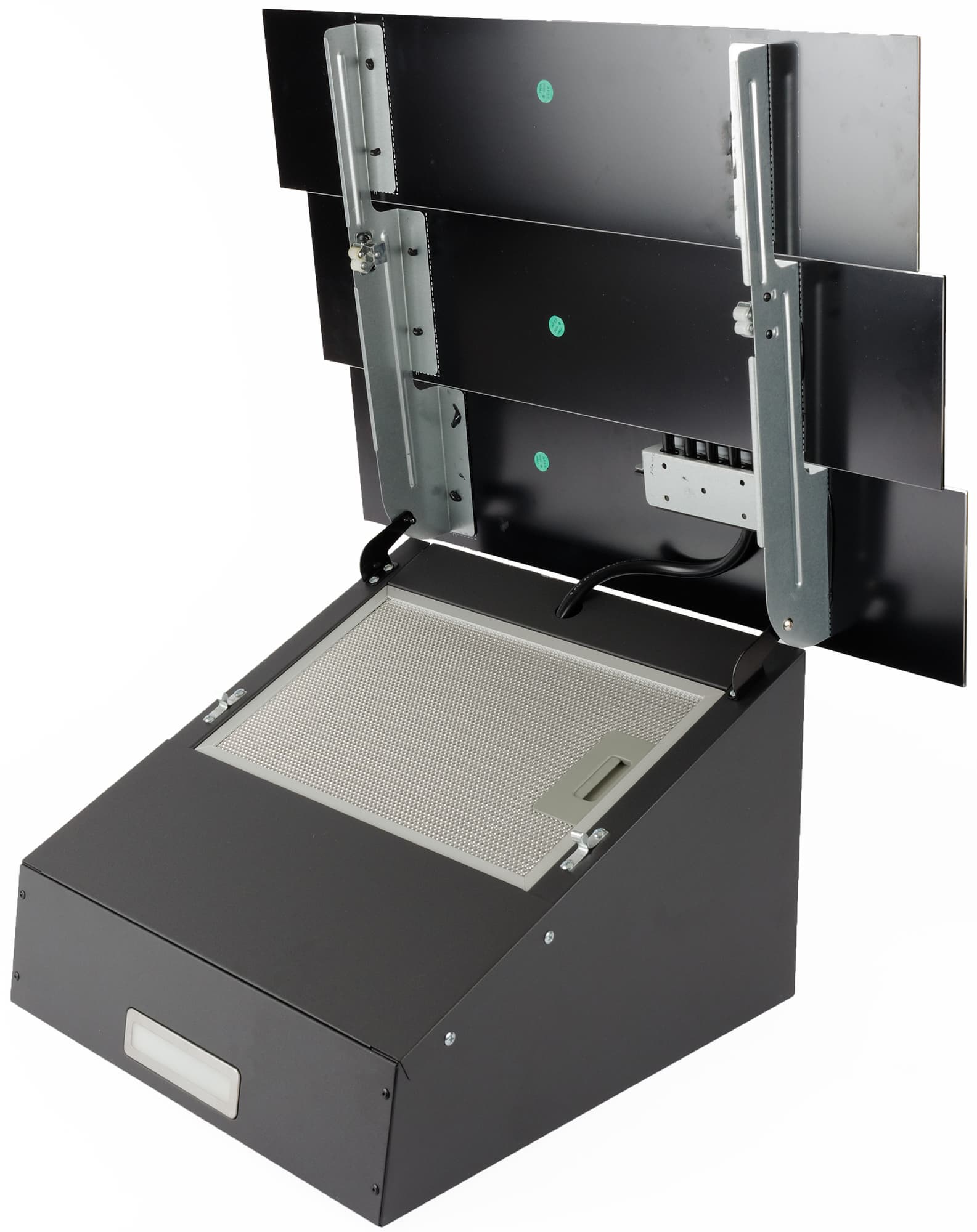 Три стеклянные панели закреплены на двух алюминиевых рейлингах и откидываются вверх для обслуживания жироулавливающего фильтра.