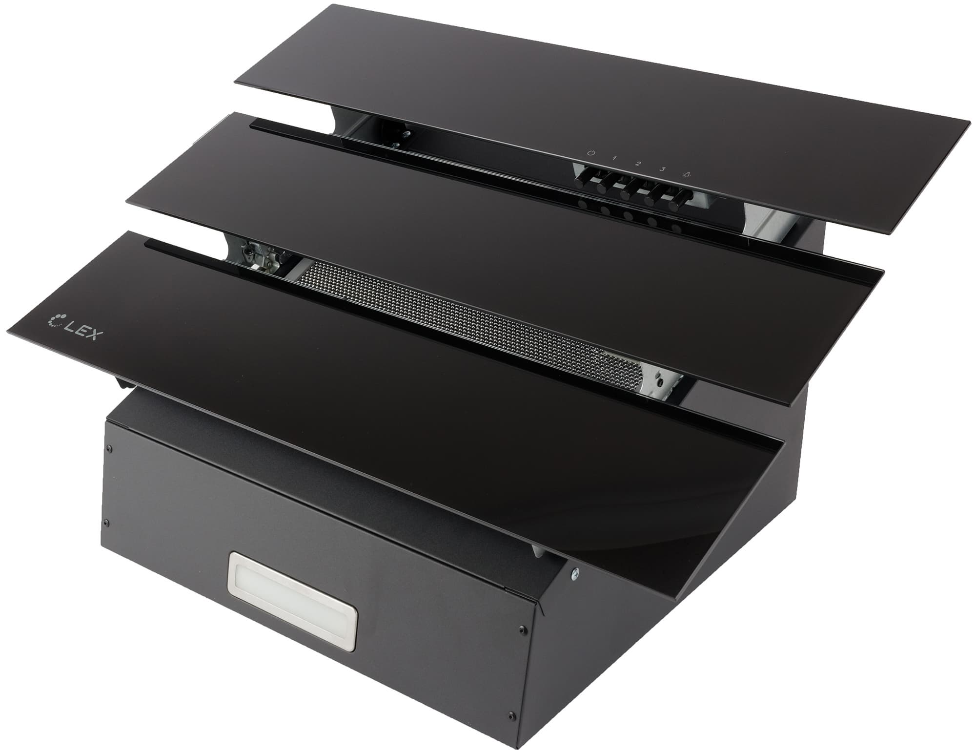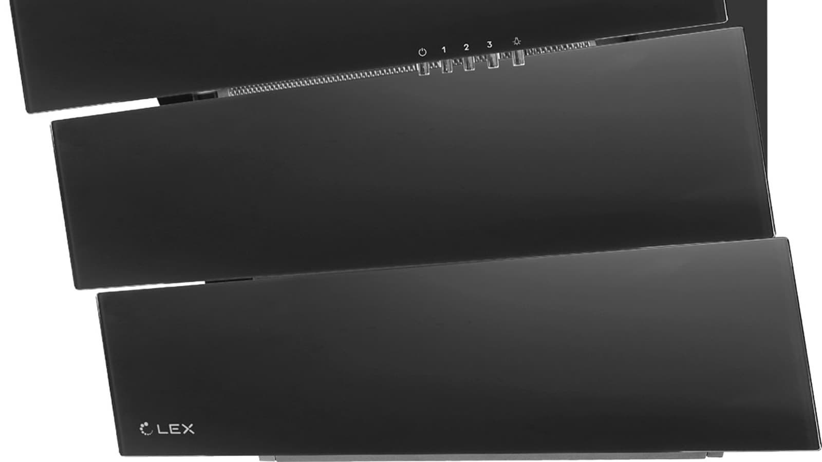 Lex Rio G 600 — наклонная вытяжка необычной конструкции. Стеклянная панель, под которой скрывается фильтр, не цельная, как это чаще всего бывает у подобных моделей, а разделенная на три прямоугольных полосы, расположенные уступом.