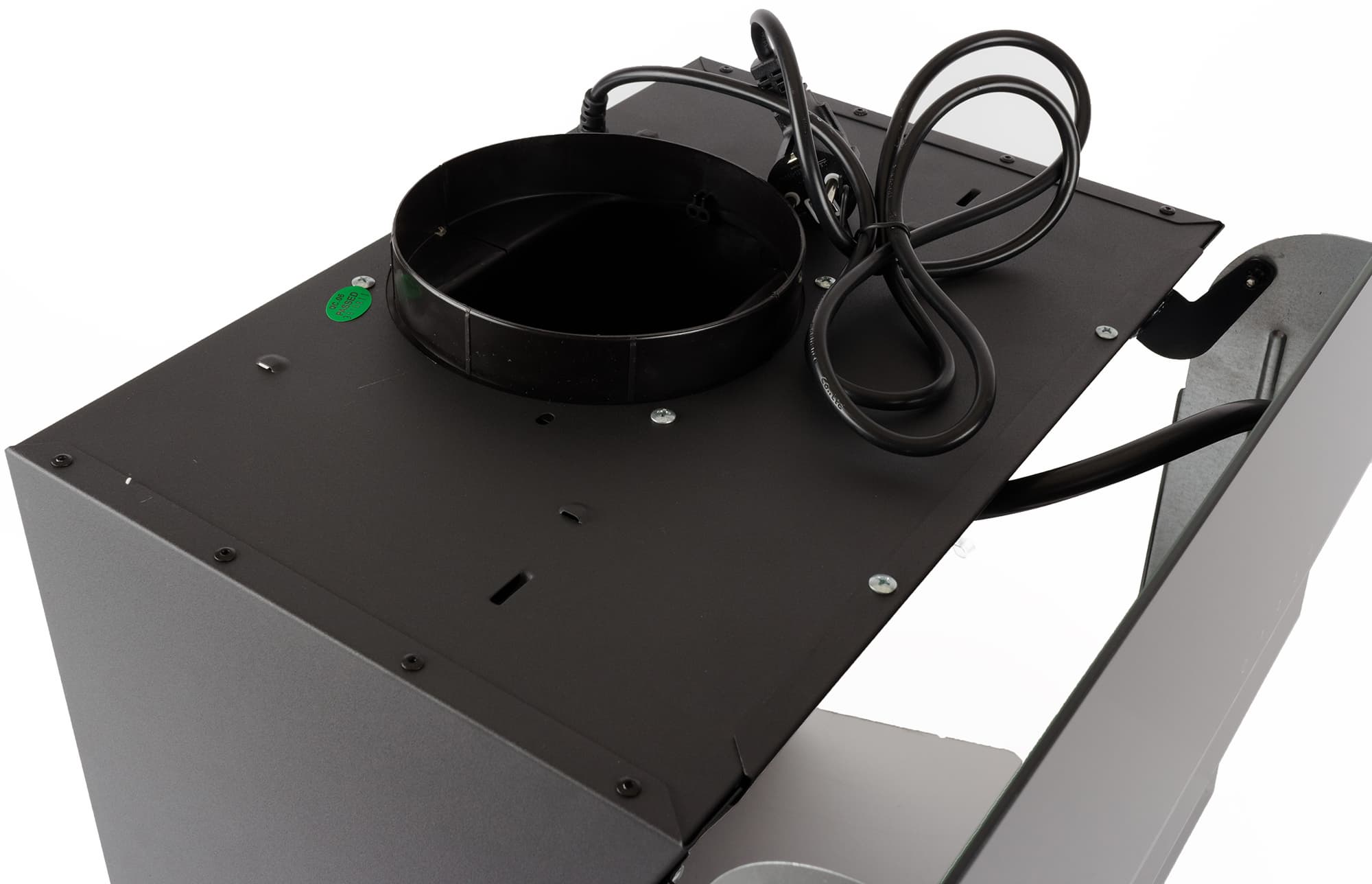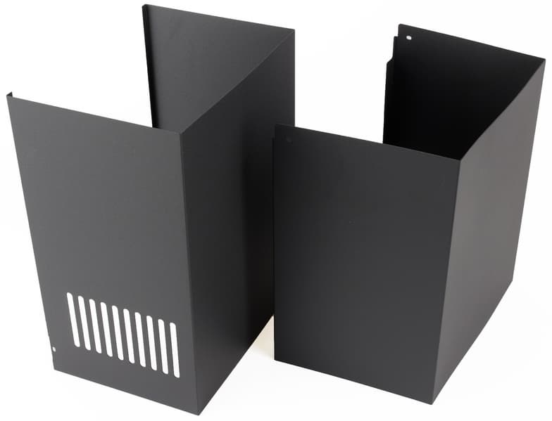 Декоративный короб, призванный скрывать вентиляционный канал, выкрашен в тот же радикально черный цвет, что и вытяжка. Он состоит из двух частей, вставляющихся одна в другую и позволяющих регулировать высоту установки в широких пределах. На боковых сторонах верхней половины находятся вентиляционные решетки, а нижняя украшена логотипом производителя.