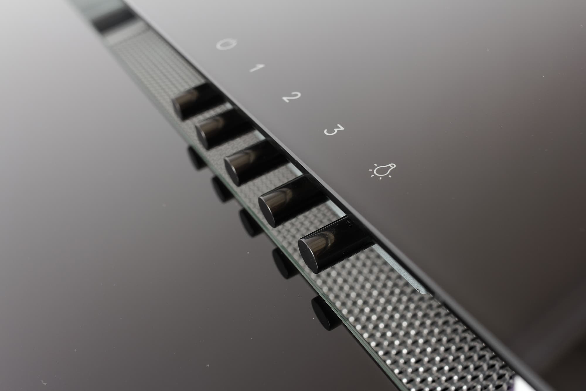 На нижнюю панель нанесен логотип производителя, между средней и верхней располагается кнопочный блок управления. Никаких других украшений у вытяжки нет: ее дизайн строг, современен и необычен.