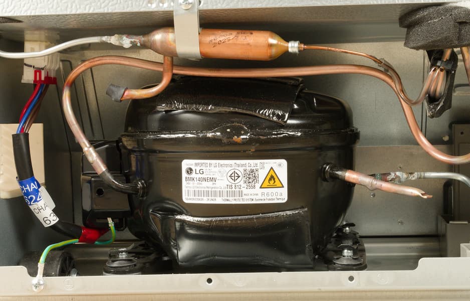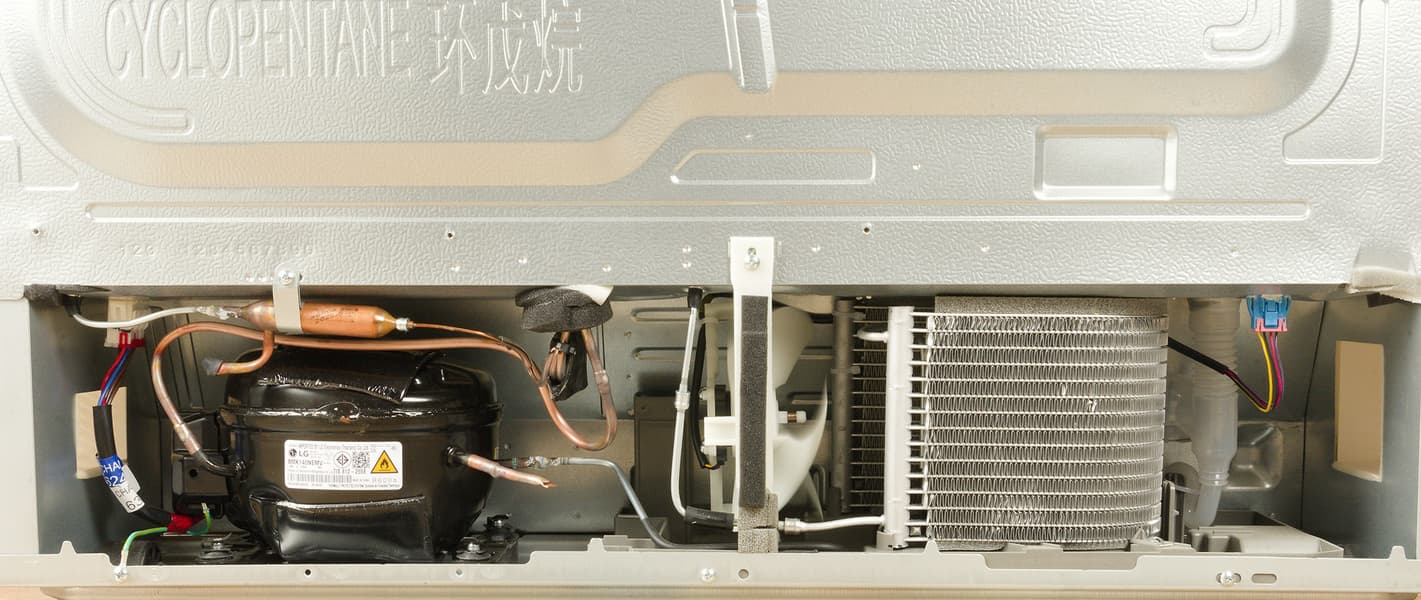 В конструкции холодильника использован инверторный компрессор 8MK140NEMV собственного производства LG. Он установлен на резиновых демпферах, снижающих шум и вибрацию.