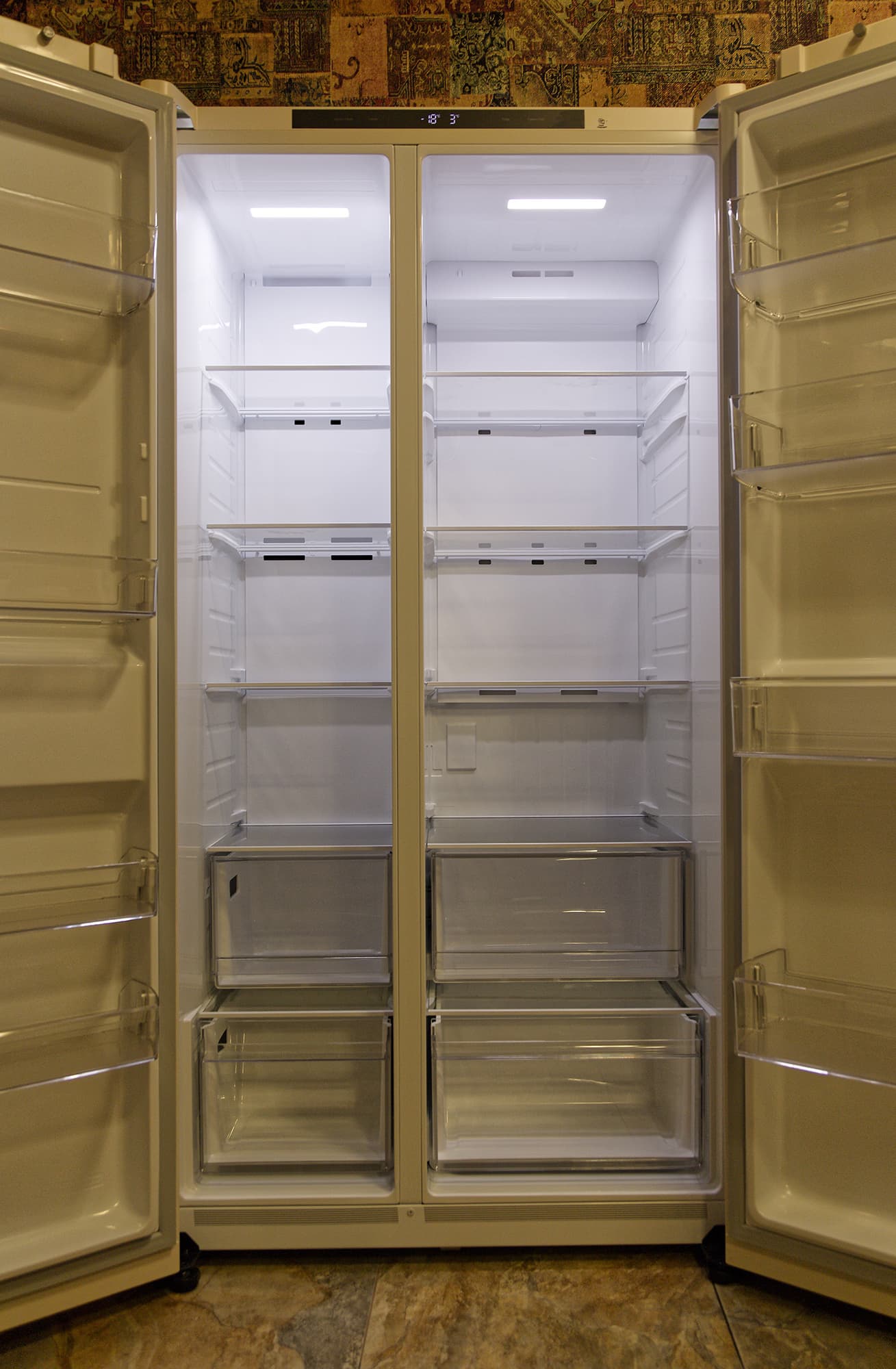 Соответственно, согласно нашим измерениям, общая емкость холодильника составляет 546 литров. По данным производителя, полезный объем — 658 л, полный — 703 л.