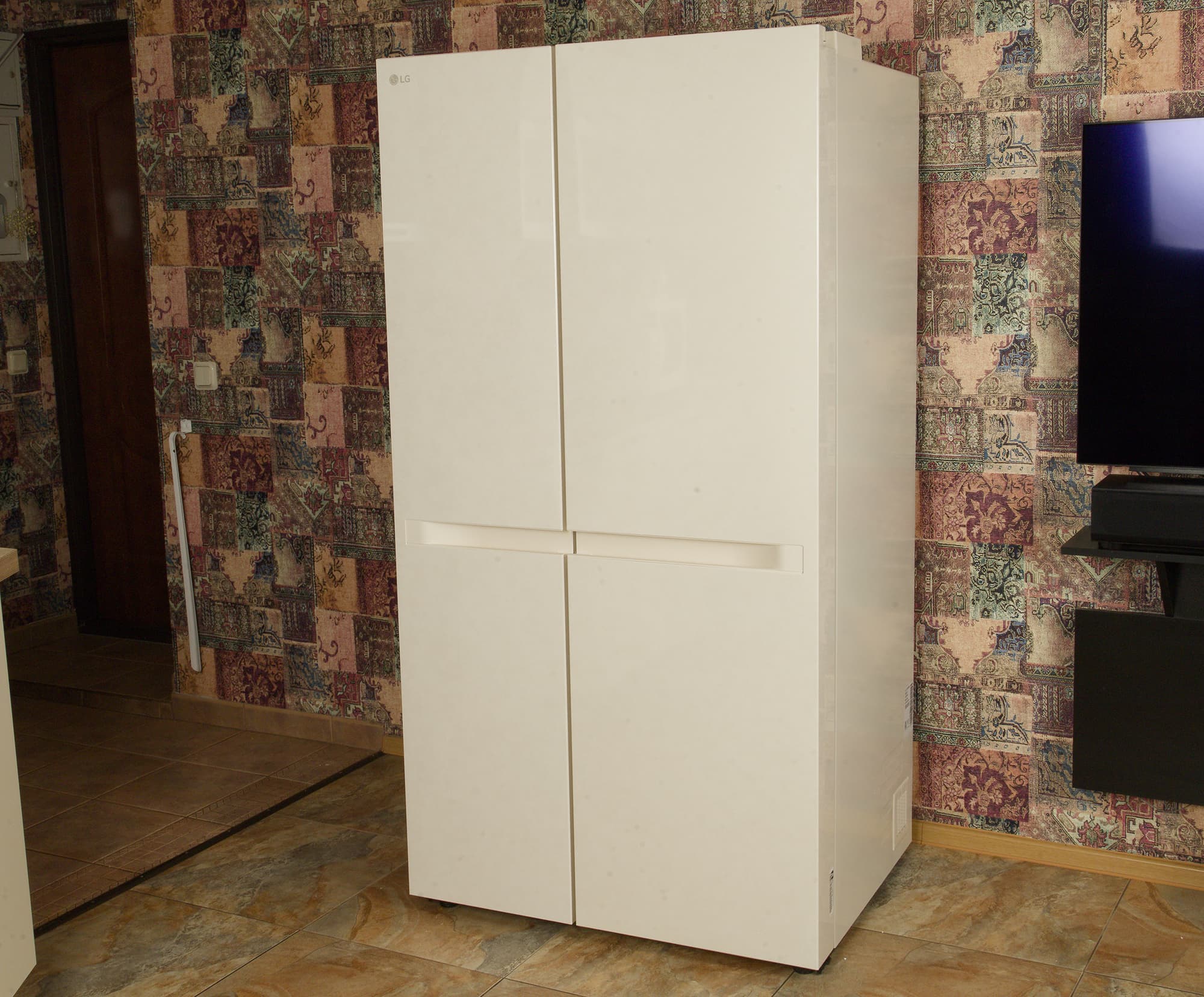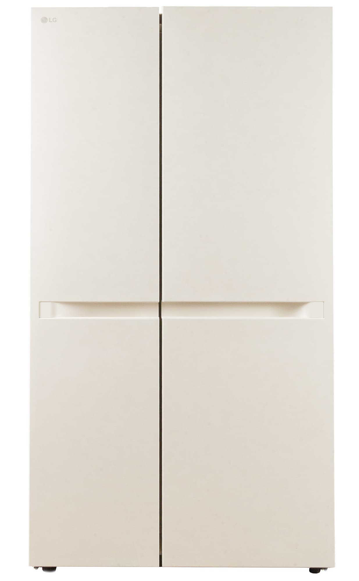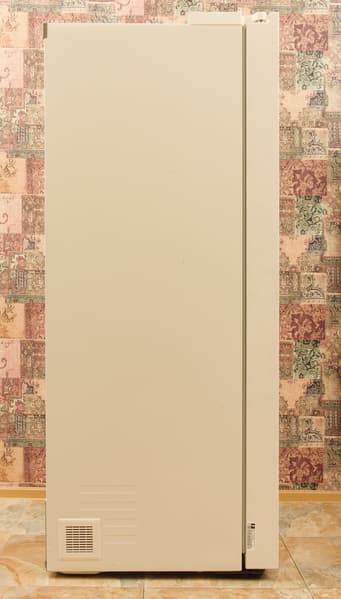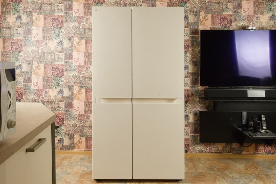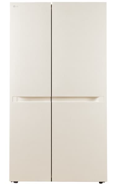 У холодильника LG GC-B257KEHW классическая конструкция side-by-side: двери распахиваются в обе стороны, слева располагается морозильное, а справа — холодильное отделение. Цвет нашей модели — светло-бежевый. Гладкие передние панели украшены декоративной «мраморной» текстурой, заметной при ярком освещении.